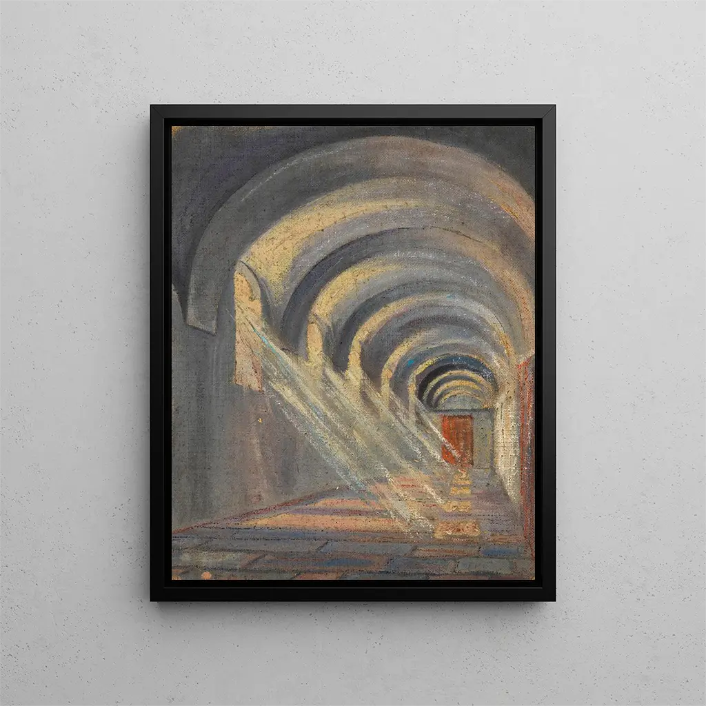 Egon Schiele, kendt for sin karakteristiske stil og evne til at udtrykke komplekse følelser, anvender her en rig og dristig palet. Kunstværket "Cloître med direkte sollys" skiller sig ud med sine iøjnefaldende lyslege, hvor solen trænger gennem klostrets buer og skaber slående kontraster mellem de oplyste områder og de dybe skygger. Kompositionen er både stringent og dynamisk, hvilket vidner om kunstnerens tekniske kunnen. De kantede linjer og stiliserede former afslører en modernistisk tilgang, der udfordrer tidens konventioner. Schiele nøjes ikke med at gengive virkeligheden; han genopfinder den, og tilfører hvert penselstrøg en mærkbar følelsesmæssig ladning, der resonnerer med seeren.