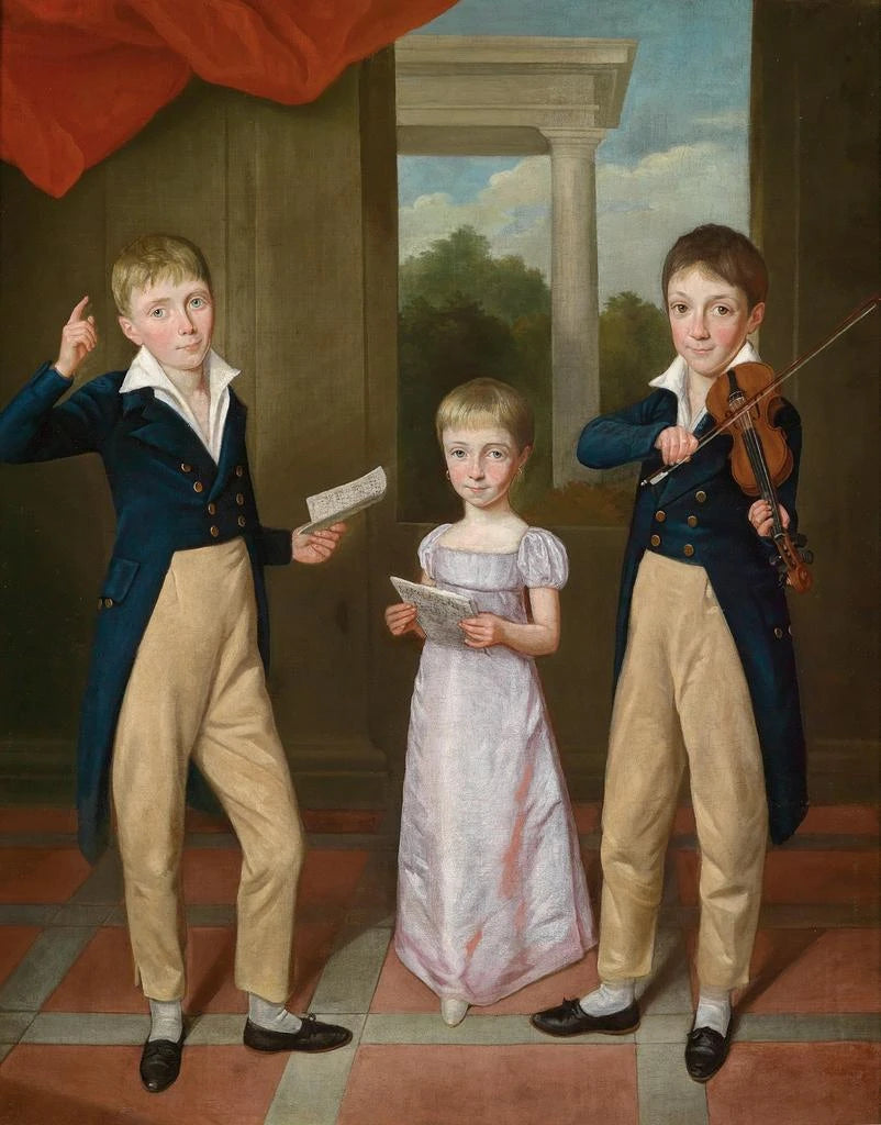 Reproduktion Koncert med Tre børn i et hus - Antoine-Jean Gros – Fascinerende introduktion I den rige og livlige kunsthistorieverden formår nogle værker at fange selve essensen af barndom, uskyld og glæde. "Koncert med Tre børn i et hus" af Antoine-Jean Gros er et af disse værker, der gennem sin tilsyneladende enkelhed vækker dybe og universelle følelser. Dette værk, der skildrer en intim scene, hvor tre børn dyrker musik, transporterer os til en verden, hvor hverdagen blandes med magien i barndommen. Ved at betragte dette kunsttryk føler man en invitation til at genopdage livets enkle glæder gennem en kunstners prisme, der har formået at indfange et flygtigt øjeblik med en uovertruffen finesse. Værkets stil og særpræg Antoine-Jean Gros' stil skiller sig ud gennem sin omhyggelige opmærksomhed på detaljer og sin subtile brug af lys. I "Koncert med Tre børn i et hus" stråler børnenes ansigter af friskhed og udtryksfuldhed, der fascinerer betragteren. Hvert gestus, hvert smil er en hyldest til spontaniteten i barndommen. Gros, som farvens mester, bruger bløde nuancer, der skaber en varm og indbydende atmosfære. Kompositionen, centreret omkring børnene, giver en følelse af scenens samhørighed. De omkringliggende elementer, selvom de er til stede, skygger ikke for det væsentlige: samspillet mellem børnene og deres passion for musik. Dette værk er således et spejl af hverdagen, forfinet gennem kunst, hvor hver detalje bidrager til den visuelle fortælling. Kunstneren og hans indflydelse Antoine-Jean Gros, fransk maler fra begyndelsen af 1800-tallet, er ofte anerkendt for sine historiske værker og portrætter, men han har også formået at gøre sig gældende inden for genre-scener. Hans innovative tilgang og evne til at fange livets øjeblikke har gjort ham bemærket i sin tids kunstlandskab. Inspireret af neoklassicismen formåede Gros at tilføre en romantisk følsomhed, hvilket gjorde hans værker tilgængelige og rørende. "Koncert med Tre børn i et hus" illustrerer perfekt denne dualitet, der kombinerer en raffineret teknik med en mærkbar følelse. Hans indflydelse varer ved.
