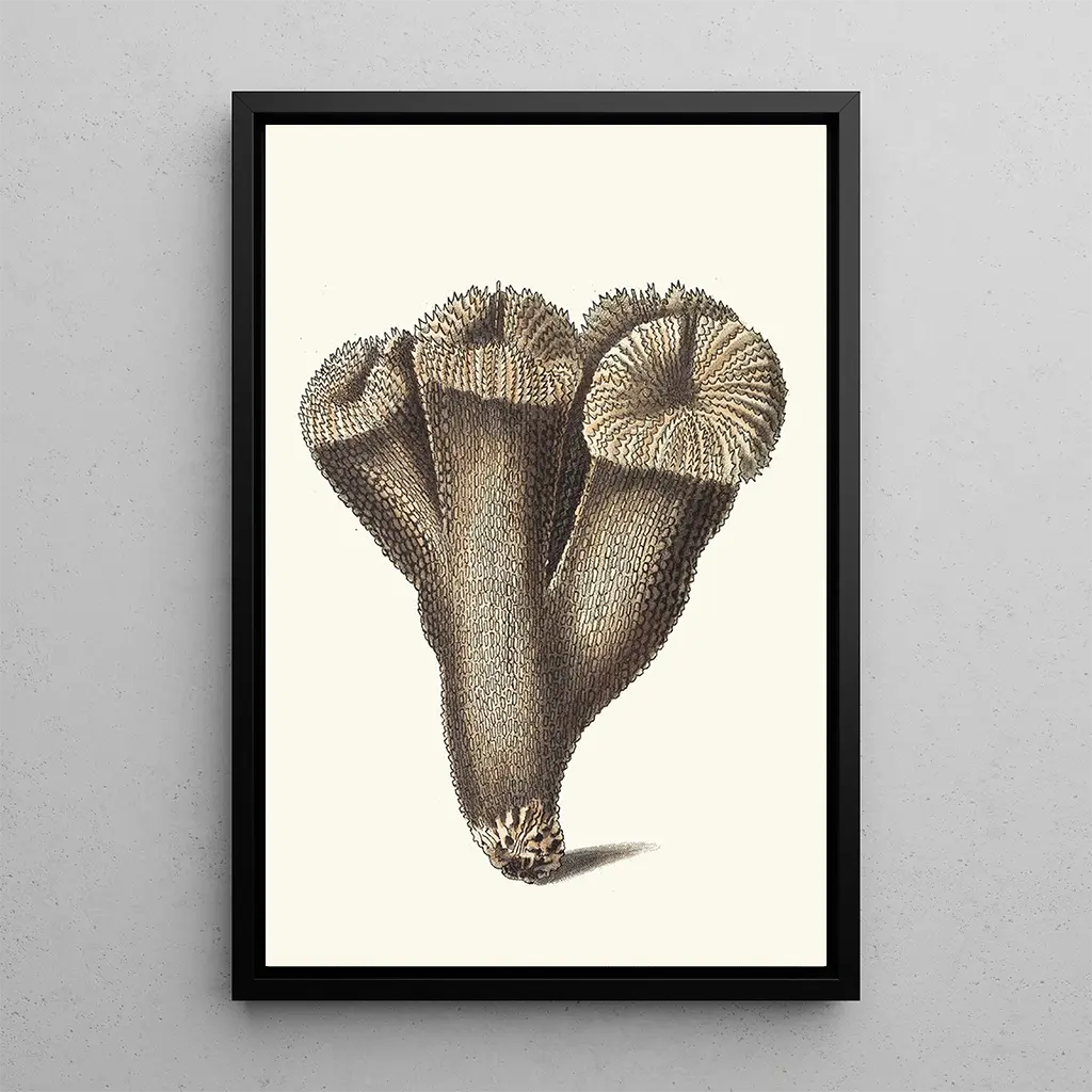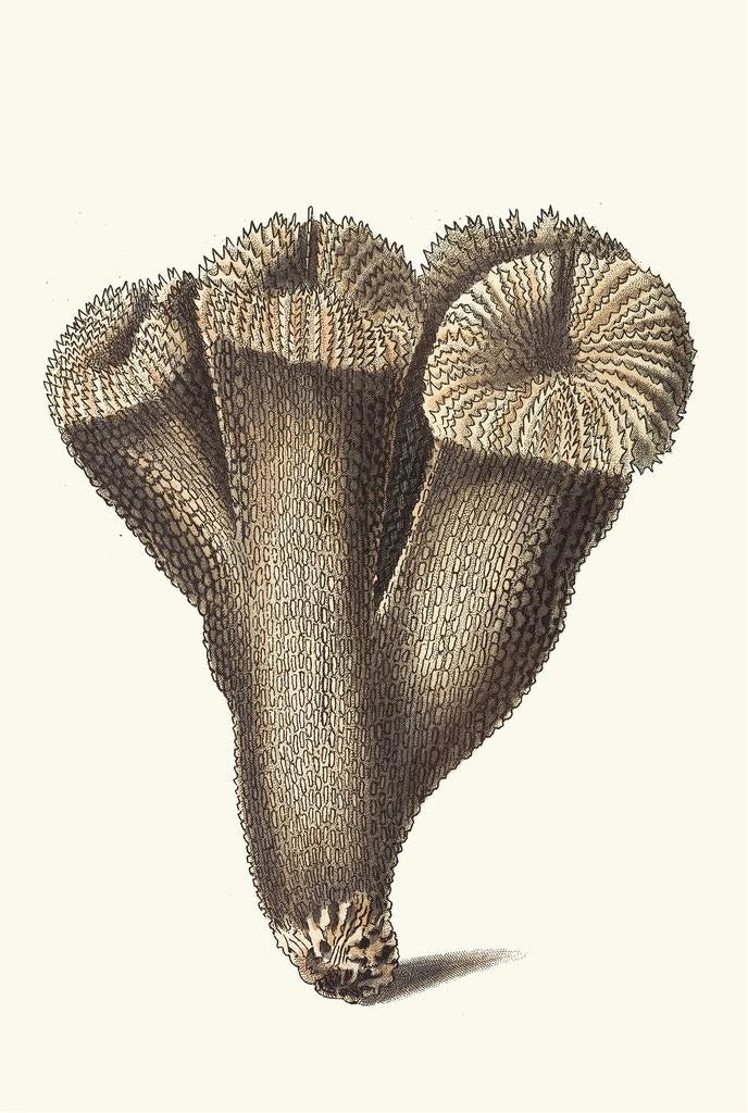 Madrepore chardon, malet af George Shaw, er en fascinerende skildring af det marine liv. Dette værk, rigt på detaljer, fanger kompleksiteten og skønheden i korallerne, med nuancer, der spænder fra dybblå til strålende gul. Shaw bruger en præcis maleteknik, der formår at gengive de fine teksturer og organiske former af disse undervandsvæsener. Atmosfæren i værket fremkalder en livlig undervandsverden, hvor hvert element synes at interagere i et harmonisk ballet, og inviterer seeren til at udforske havets dybder.