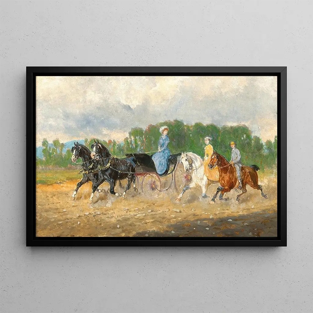 Promenade i bil : en idyllisk flugt i naturens hjerte I "Promenade i bil" tager Alexander von Bensa os med på en idyllisk scene, hvor naturen og menneskeheden sameksisterer harmonisk. Kompositionen, rig på detaljer, fremhæver et grønt landskab badet i blødt lys. Farverne, fra skinnende grønne til jordnære nuancer, skaber en fredelig og indbydende atmosfære. Kunstnerens teknik, der dygtigt blander realisme med en impressionistisk touch, inviterer betragteren til at føle roen i dette ophængte øjeblik. Hvert element, fra køretøjet til de majestætiske træer, synes at fortælle en historie, nemlig en flugt ud i naturen. Alexander von Bensa : en mester i romantisk landskab Alexander von Bensa, aktiv i det 19. århundrede, er kendt for sine landskaber, der fanger skønheden i naturen og dagligdagen. Påvirket af den romantiske bevægelse søger han at udtrykke følelser gennem sine værker, samtidig med at han henter inspiration fra tidens store mestre. Hans evne til at lege med lys og skygger gør det muligt for ham at skabe unikke atmosfærer, hvilket gør ham til en uundværlig kunstner inden for romantisk landskab. Bensa formåede at præge sin tid med sine skildringer af landlivet, hvilket giver et nostalgisk blik på en verden i hastig forandring. En dekorativ tilføjelse med mange fordele Kunsttrykket af "Promenade i bil" er et ideelt dekorativt valg til at forskønne din stue, dit kontor eller soveværelse. Dets trykkvalitet og trofasthed mod detaljerne i det originale værk gør det til et fængslende billede, der tiltrækker opmærksomhed. Ved at integrere dette lærred i din indretning tilføjer du et strejf af elegance og ro til dit rum. Dets æstetiske appel og evne til at fremkalde følelser gør det til et centralt element i dit hjem, hvilket skaber en varm og indbydende atmosfære.