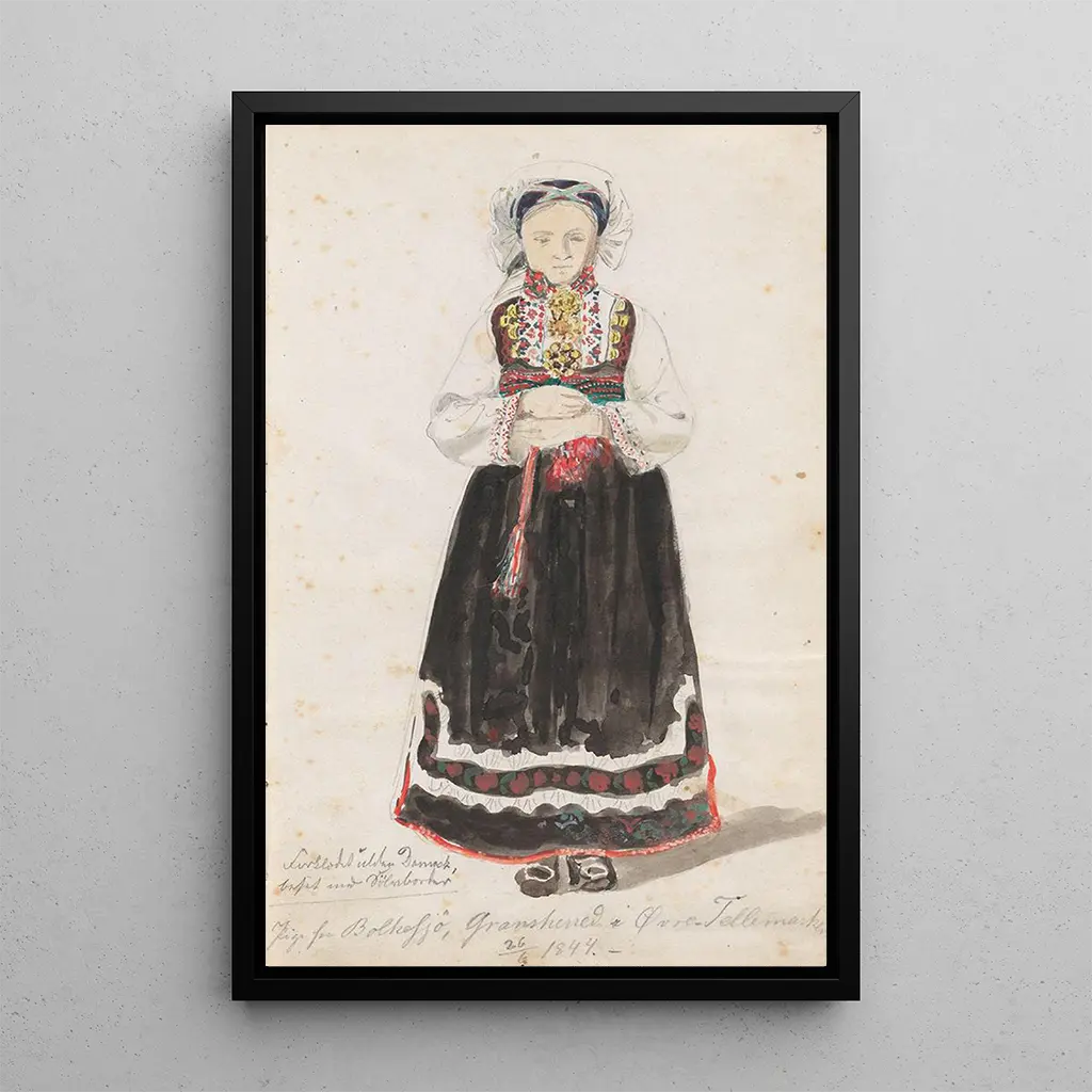 Studie af kostume Bolkesjø: en hyldest til den norske beklædningskultur I kunsttrykket af "Studie af kostume Bolkesjø" giver Adolph Tidemand os et fascinerende indblik i de norske traditionelle kostumer. De livlige farver og de fine mønstre i tøjet fremhæves af et blødt lys, der understreger de minutøse detaljer. Tidemand, med sin realistiske stil, formår ikke kun at fange udseendet af kostumerne, men også ånden i den norske kultur. Dette værk fremkalder en tid, hvor hvert stykke tøj fortalte en historie, og hvor beklædningstraditioner var et spejl af den regionale identitet. Adolph Tidemand: den skandinaviske folkeligheds mester Adolph Tidemand, født i 1814, er en ikonisk figur i den norske kunst fra det 19. århundrede, kendt for sine skildringer af landlivet og folkelige kostumer. Hans passion for den skandinaviske kulturarv har ført ham til at udforske og udødeliggøre landets beklædningstraditioner. Tidemand blev påvirket af romantikken, men hans realistiske tilgang gjorde ham unik. Hans værker betragtes i dag som værdifulde vidnesbyrd om Norges sociale og kulturelle historie, hvilket gør ham til en uundværlig kunstner i sin tid. En dekorativ kunsttryk med mange fordele Kunsttrykket af "Studie af kostume Bolkesjø" er et dekorativt stykke, der beriger ethvert rum, uanset om det er en stue, et kontor eller et soveværelse. Dets trykkvalitet, tro mod detaljerne i det originale værk, gør det til et ideelt valg for kunst- og kulturentusiaster med interesse for Skandinavien. Det æstetiske tiltrækningskraft ved dette lærred, med sine livlige farver og traditionelle mønstre, tilføjer et præg af autenticitet og charme til dit hjem. Ved at vælge dette kunsttryk får du ikke blot en dekoration, men også et stykke historie, der vil fange dine gæsters opmærksomhed.