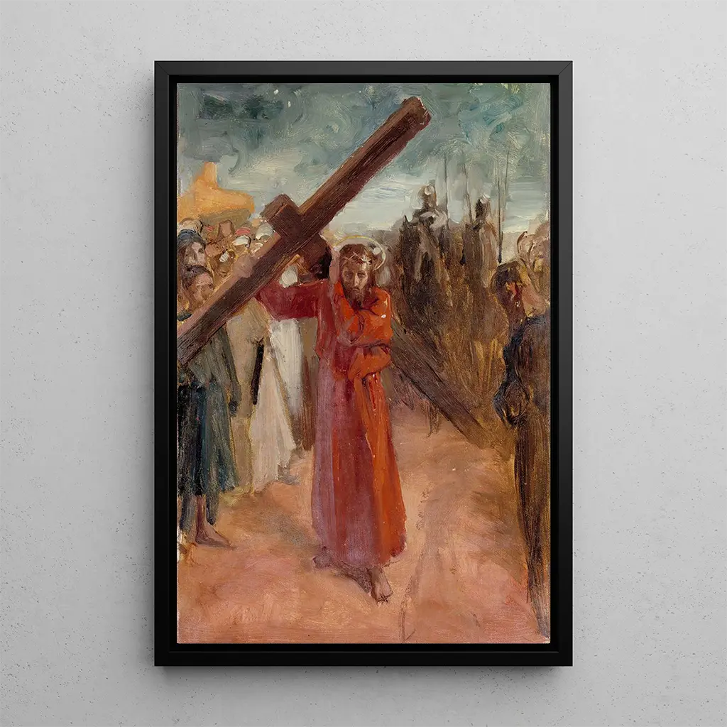 I dette rørende værk fanger Albert Edelfelt det dramatiske øjeblik, hvor Kristus, der bærer sit kors, går fremad med en beslutsomhed præget af smerte. De mørke farver dominerer lærredet og skaber en atmosfære af alvor og spænding. Legene med skygger og lys fremhæver Kristi ansigtstræk, hvilket afslører en dyb og rørende menneskelighed. Kompositionen er omhyggeligt afbalanceret, med omkringstående figurer, der synes at vidne om denne prøvelse, hvilket tilføjer den følelsesmæssige dybde til scenen. Edelfelt formår at formidle en fornemmelse af bevægelse, som om betragteren inviteres til at følge Kristus på denne vej gennem lidelse.