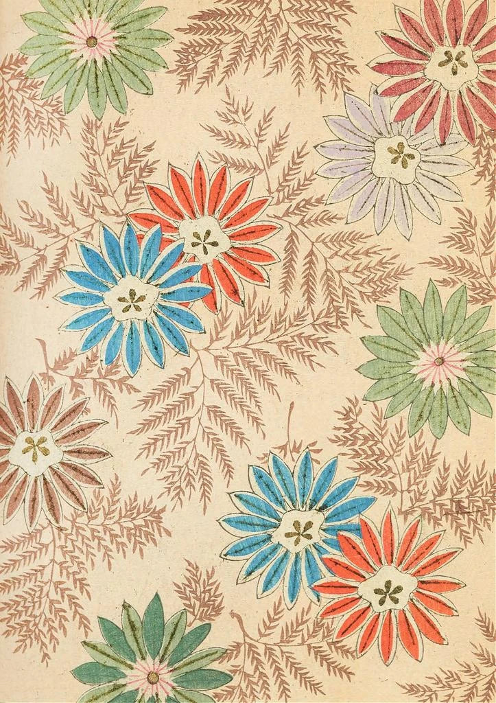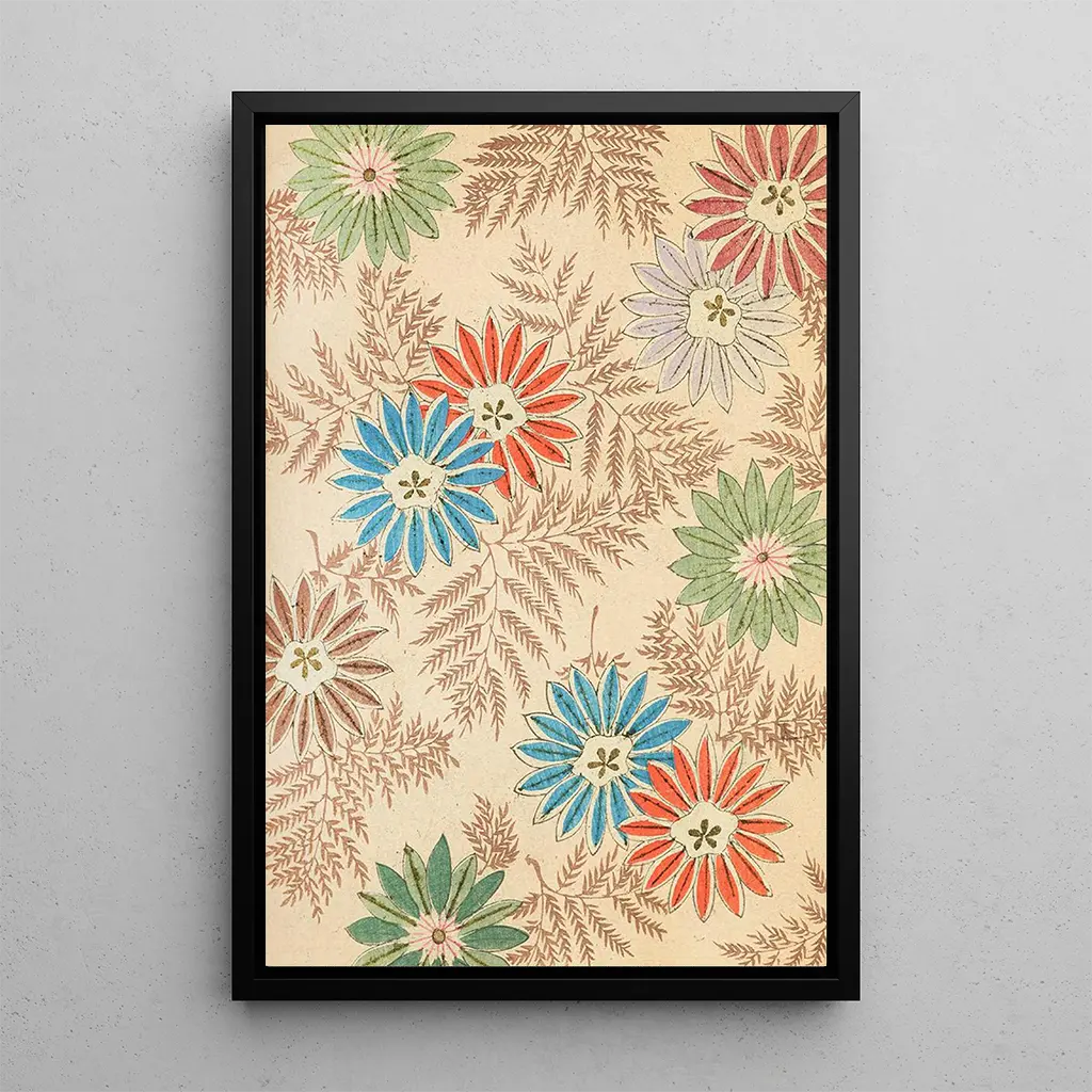 Kunsttrykket af Bijutsukai Pl143, også signeret af Furuya Korin, tager os med til en frodig have, hvor blomsterne blomstrer yndefuldt. De delikate nuancer af rosa og grøn flettes sammen og skaber en beroligende og fængslende visuel komposition. Kunstnerens raffinerede teknik, der kombinerer akvarel og blæk, giver liv til hver enkelt blomst, hvert blad, som om de var fyldt med en egen energi. Atmosfæren, der udspringer af dette lærred, er både blid og dynamisk, hvilket inviterer betragteren til at fordybe sig i naturens skønhed, samtidig med at den fremkalder en vis melankoli, der er karakteristisk for japansk kunst.