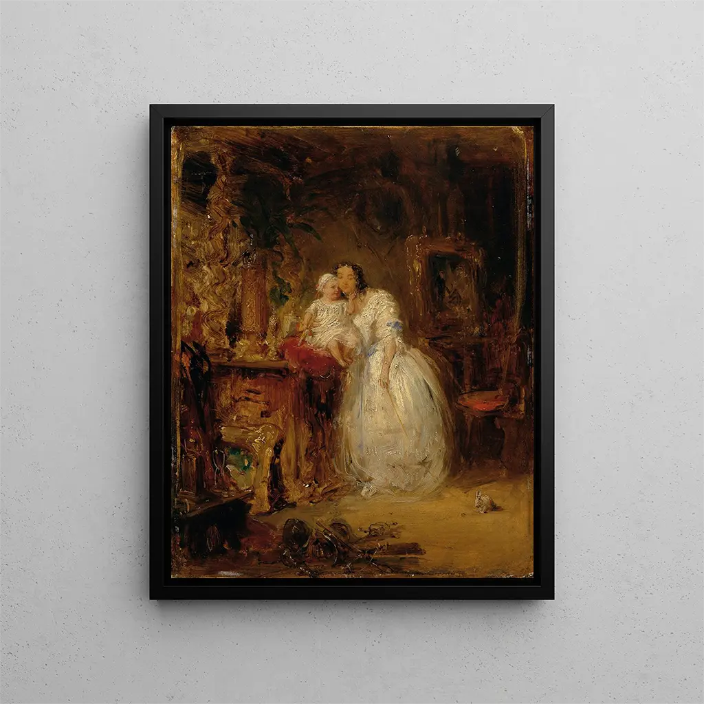 Kunsttryk Ægtefælle og datter af kunstneren - Eduard Ender – Fascinerende introduktion I det store panorama af kunsthistorien formår visse værker at fange selve essensen af menneskeheden, overskridende tid og stilarter. "Ægtefælle og datter af kunstneren - Eduard Ender" skiller sig ud med glans i denne kategori. Dette værk, præget af blidhed og finesse, inviterer os til at dykke ned i en kunstnerisk hjemlighed, hvor familiekærlighed og kreativitet mødes. Eduard Ender, maler fra det 19. århundrede, formår at indfange et øjeblik i livet, en scene der resonnerer med de universelle følelser af kærlighed og hengivenhed. Ved at betragte dette værk transporteres seeren til en verden, hvor hver detalje fortæller en historie, og hvor hvert blik udvekslet mellem de malede figurer antyder en dyb forbindelse. Stil og særpræg ved værket Eduard Enders stil skiller sig ud ved sin evne til at forene realisme og følsomhed. I "Ægtefælle og datter af kunstneren" spiller lyset en afgørende rolle, idet det subtilt oplyser ansigterne på de to kvinder og afslører udtryksfulde følelser. Farverne, bløde og harmoniske, skaber en varm atmosfære, næsten håndgribelig. Ender excellerer i gengivelsen af teksturer, hvad enten det er de delikate stoffer i tøjet eller den bløde hud. Hvert penselstrøg vidner om en imponerende teknisk mestring, samtidig med at det formidler en psykologisk dybde, der giver værket en ekstra dimension. Kompositionen, omhyggeligt arrangeret, guider seerens blik og inviterer til at udforske de subtile aspekter af denne hjemlige scene, hvor hverdagen får et poetisk præg. Kunstneren og hans indflydelse Eduard Ender, født i 1822 i Wien, forbindes ofte med realismebevægelsen, men hans værk overskrider simple klassifikationer. Uddannet i prestigefyldte værksteder, har han formået at udvikle en personlig stil, der kombinerer akademisk stringens med romantisk følsomhed. Påvirket af sine samtidige, er han også præget af de kunstneriske traditioner fra sin barndom. Hans evne til at fange dagligdagen og samtidig tilføre en stærk følelsesmæssig dimension har gjort ham til en respekteret kunstner i sin tid.