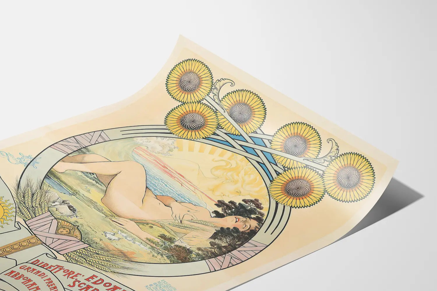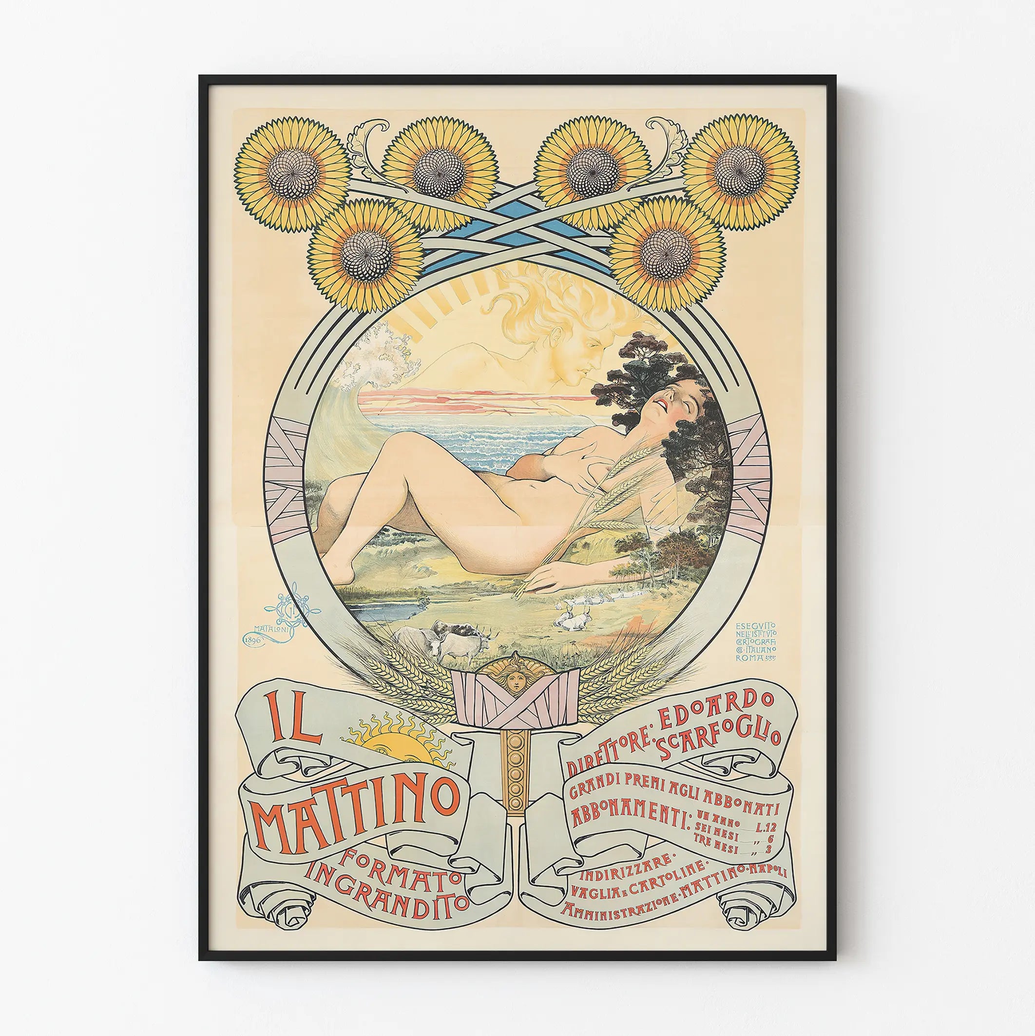 Art Nouveau plakat Il Mattino med solsikker og kvindefigur