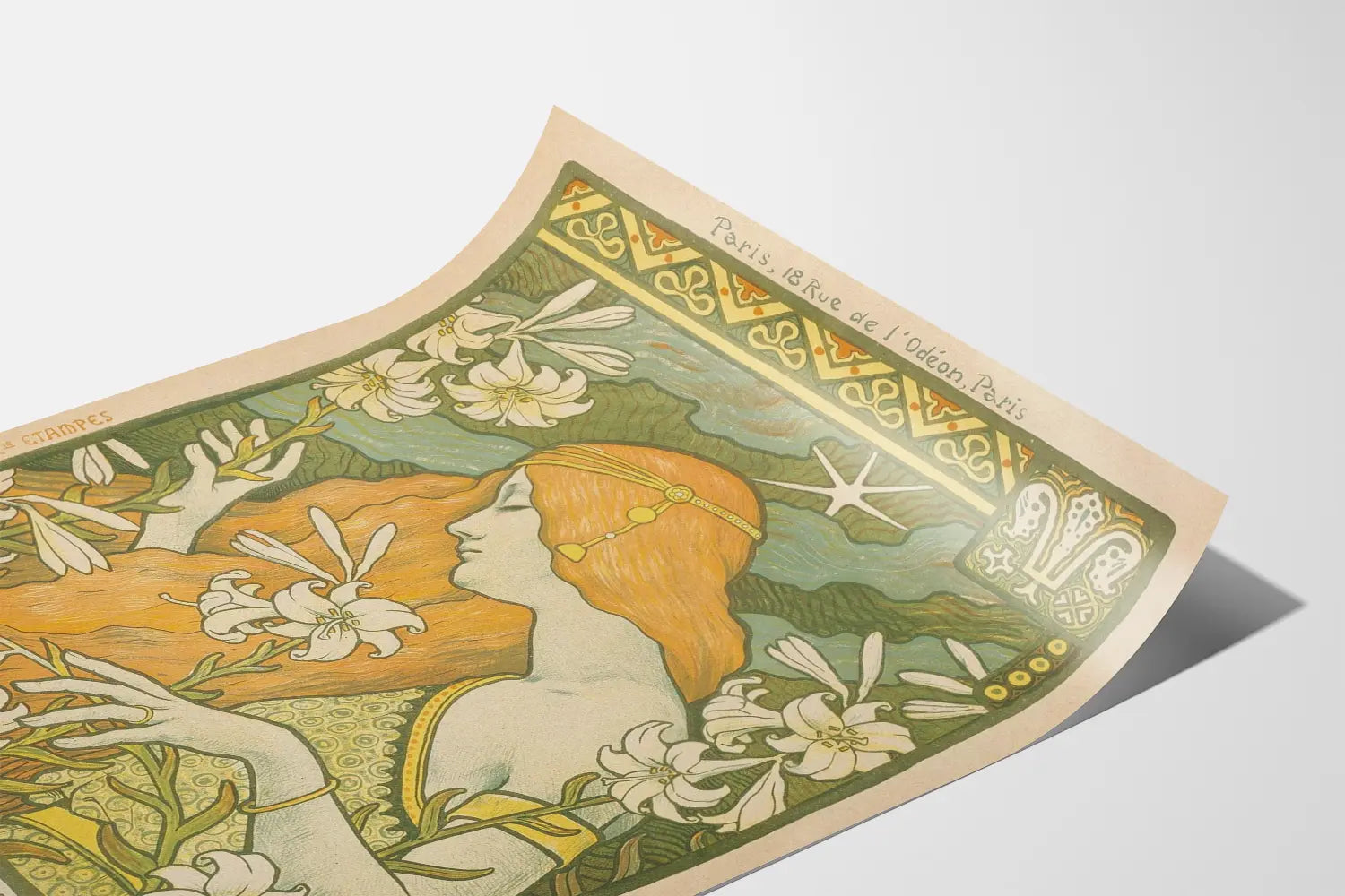 Dette vægkunstværk er også en smuk gaveidé til kunstelskere og designhistorieentusiaster, da det illustrerer en vigtig æra i udviklingen af dekoration og reklameplakater. Tilstedeværelsen af detaljer som inskriptionen "Paris, 18 Rue de l’Odéon" og trykkeriets signatur Camille Ginard & Cie Étampes giver også et præg af ægthed til dette tryk, hvilket afspejler det håndværk, der var i gamle dage.