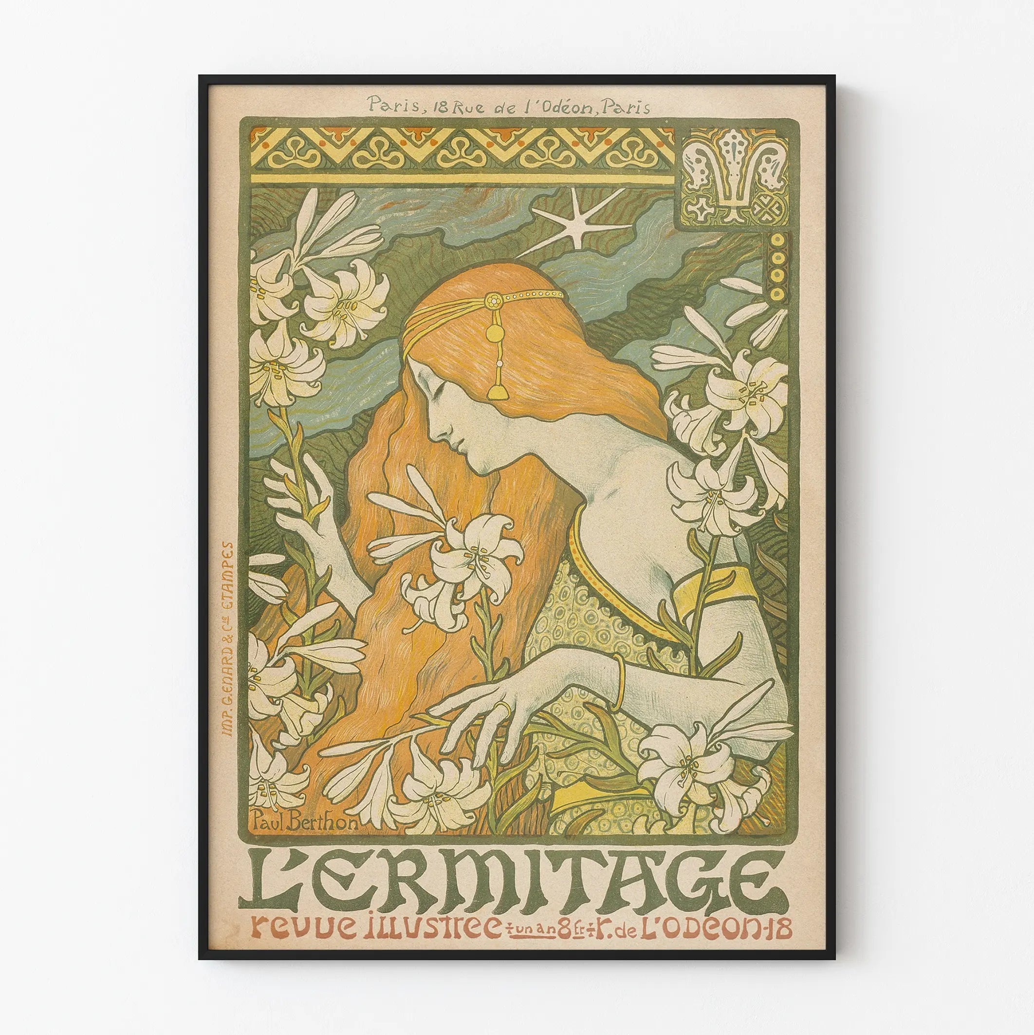 Opdag dette smukke Art Nouveau-plakat med titlen "L'Ermitage", signeret af kunstneren Paul Berthon. Denne plakat forestiller en kvinde med lange, bølgende røde hår, omgivet af mange hvide liljer, omhyggeligt detaljeret. Dette værk fremkalder en fredelig og harmonisk atmosfære, perfekt til at fremhæve ethvert rum dedikeret til vægdekoration.
