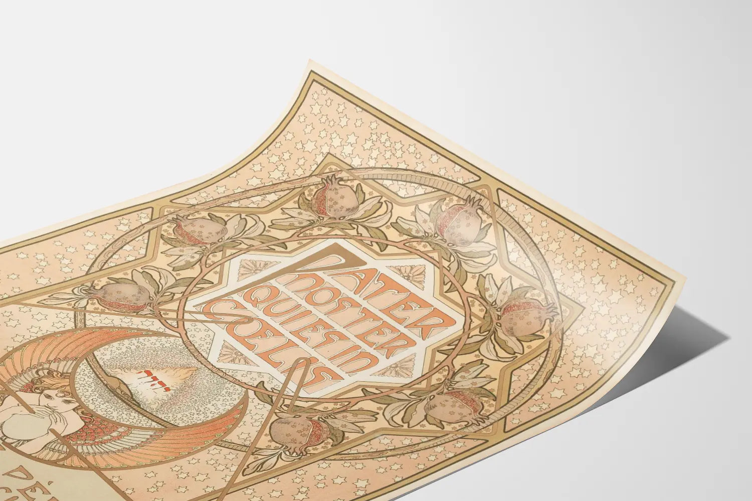 Opdag dette farverige Art Nouveau-plakat i bløde nuancer af beige, brun og lyse rød, perfekt til en elegant og raffineret vægdekoration. Denne plakat viser en grafisk sammensætning centreret omkring inskriptionen "Pater Noster qui es in coelis" efterfulgt af den franske oversættelse "Vores Fader, som er i himlene", fremhævet med en stilfuld og ornamenteret typografi, der er karakteristisk for Art Nouveau-bevægelsen. Szenen er omgivet af en dekorativ ramme med mange stjerner og granatæbler, symboler ofte forbundet med liv, genfødsel eller spiritualitet. I midten ses en vingeprydet engel, der piber i en cirkulær trompet, som indrammer en ildtrombe med hebraiske tegn, hvilket understreger en mystisk og hellig dimension i værket. Denne plakat er ideel til at berige dit hjem, og tilføre en kunstnerisk, historisk og spirituel stemning til din vægdekoration. Den passer perfekt til opholdsrum, kontorer eller meditationsrum, der søger en balance mellem detaljeret æstetik og inspirerende atmosfære. Giv dine vægge et unikt billede, der forener ikonografisk tradition med kunstnerisk design fra begyndelsen af det 20. århundrede, og fint illustrerer en grundlæggende tekst. Denne dekorative plakat er et perfekt valg for kunstelskere, kulturentusiaster og stilfulde religiøse elementer, der er genfortolket med en markant grafisk stil.