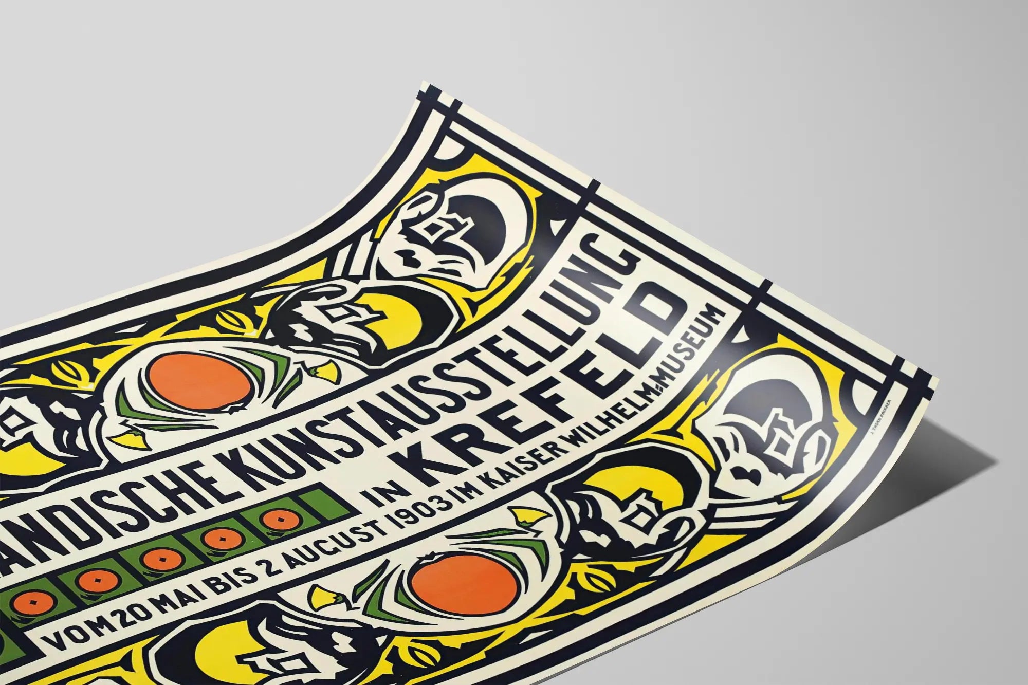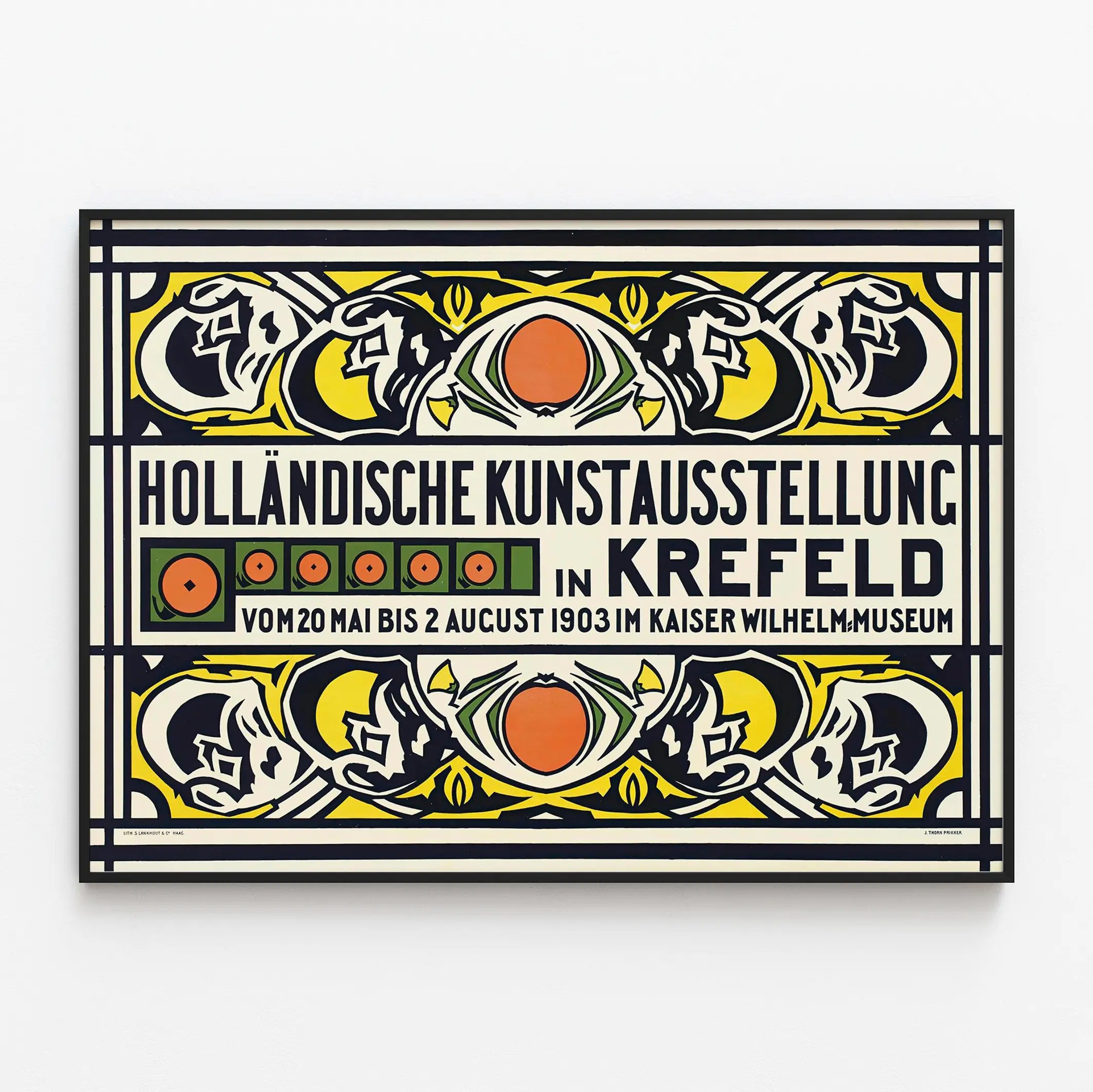 Opdag dette enestående vintage-tryk, skabt til udstillingen af hollandsk kunst i Krefeld, som fandt sted fra den 20. maj til den 2. august 1903 på Kaiser Wilhelm-museet. Dette tidsbillede, præget af Jugendstil, byder på et grafisk design præget af geometriske former og stiliserede blomstermotiver, kendetegnet ved dominerende farver som gult, grønt, sort og enkelte orange nuancer. Perfekt til en sofistikeret vægdekoration, bringer dette tryk en ånd af historie og elegance ind i ethvert hjem. Uanset om det er i en stue, et kontor eller en privat galleri, vil dette udstillingsplakat være et originalt og meningsfuldt dekorativt element. Dets afbalancerede sammensætning og rene linjer fanger den kunstneriske ånd fra begyndelsen af det 20. århundrede, ideelt for kunstelskere, vintage designentusiaster og unikke vægdekorationer. Dette vægmaleri er også en invitation til rejse gennem tiden, der minder om den kulturelle betydning af europæiske kunstudstillinger i denne periode. Giv dit rum et ægte præg med dette samlerobjekt, der nemt kan integreres i forskellige dekorationsstile, fra det klassiske til det moderne.