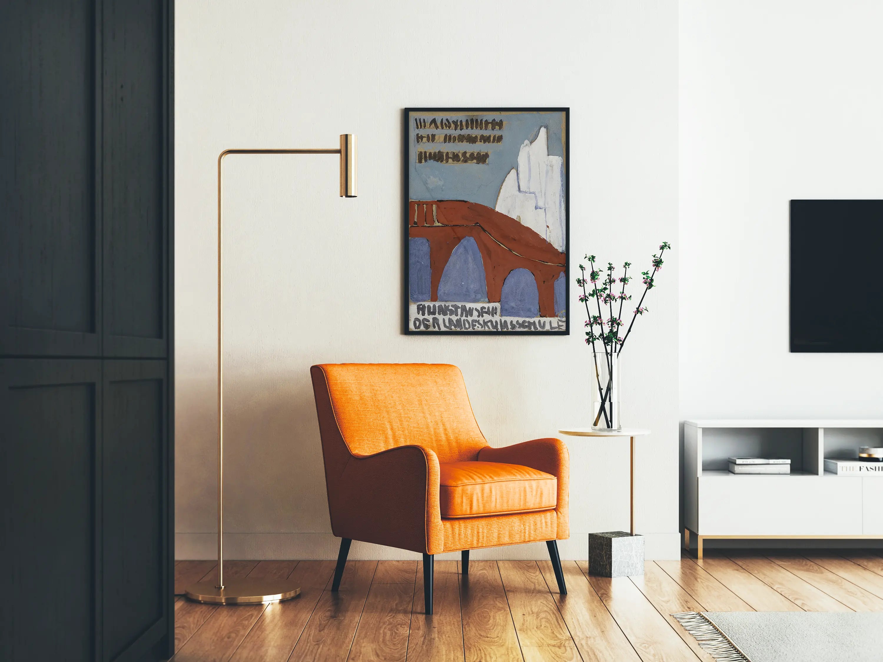 Denne originale plakat præsenterer et karakteristisk grafisk design, der blander arkitektoniske former og tekstuelle elementer. Her kan man se en bro med buede buer, malet i brun-rød, som strækker sig fra den ene side til den anden af kompositionen. I baggrunden synes en samling af hvide former med blålige konturer at repræsentere en konstruktion eller et stiliseret landskab. Baggrunden i nuancer af blå og beige skaber en blid kontrast til elementerne i forgrunden. Øverst på plakaten, sorte tekstlinjer på en okkerfarvet baggrund, samt nederst, en titel i store bogstaver, antyder en annonce eller reklame relateret til "Kunstmuseum der Landeskunstschule". Denne vægkunst, inspireret af moderne kunst og abstrakt grafik, er ideel til en original og kulturel vægdekoration. Plakaten er perfekt til at pryde et moderne interiør eller et rum dedikeret til kunst og historie. Den integreres let i en minimalistisk, boheme eller industriel stil. Denne vægdekoration inviterer til opdagelse af en europæisk kunstarv, samtidig med at den tilføjer et strejf af visuel sofistikation gennem sin balance mellem geometriske former og malede teksturer. En unik tilføjelse for kunst- og grafiske designentusiaster.