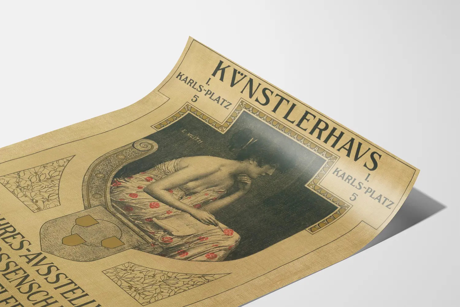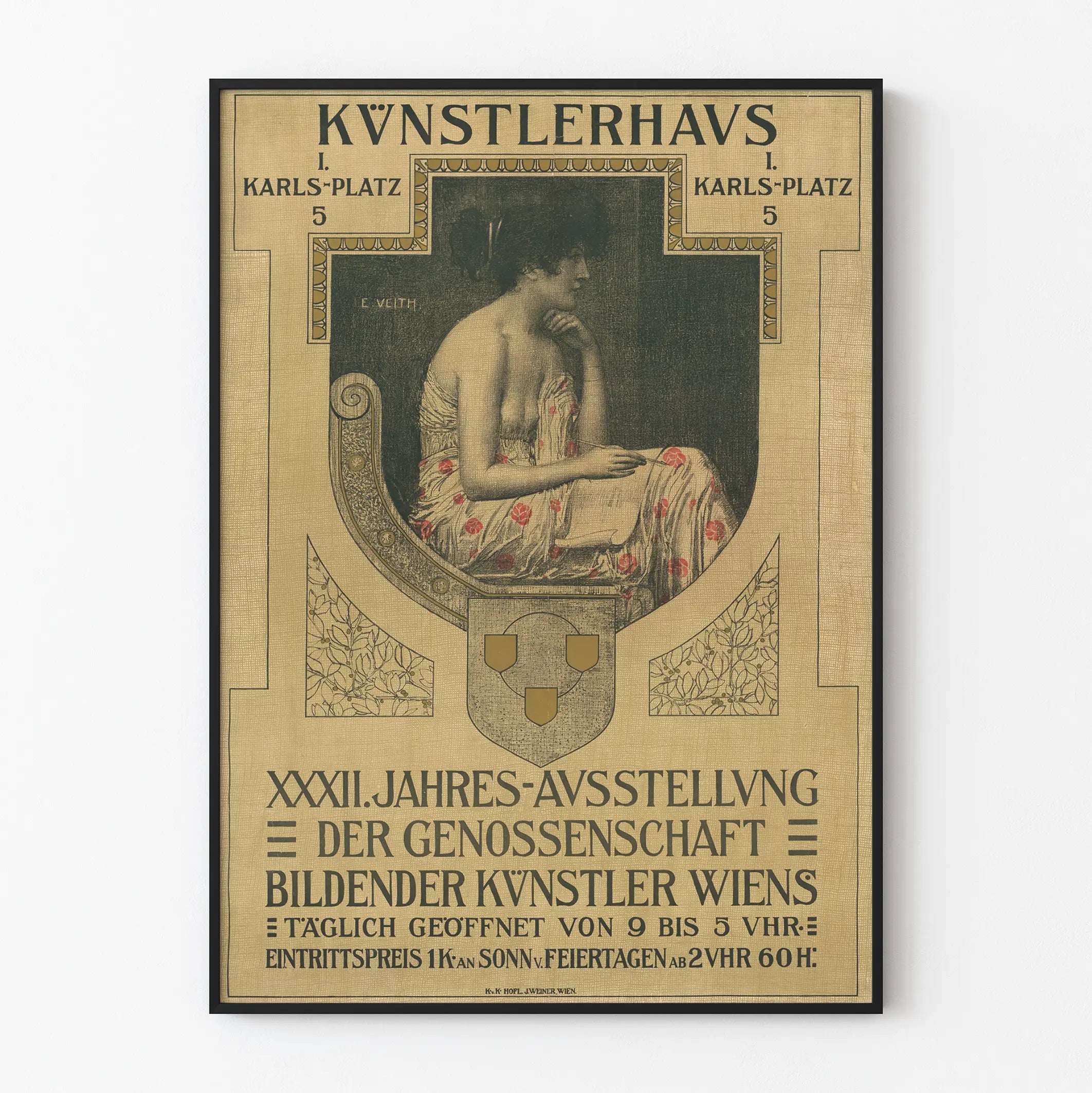 Denne vintageplakat er en elegant og kunstnerisk gengivelse af en årlig udstilling for viennese visuelle kunstnere, præsenteret på Kunstlerhaus, beliggende på Karlsplatz 5. Dette plakats er et bemærkelsesværdigt eksempel på vægdekoration, perfekt for kunstelskere og historieinteresserede designentusiaster. Den centrale illustration viser en kvindefigur i profil, siddende og iført en kjole med røde blomstermotiver på en lys baggrund, hvilket skaber en subtil, men charmerende kontrast til den mørke baggrundston. Denne plakat skiller sig ud med sin grafiske stil, der er både klassisk og raffineret, med en geometrisk sammensætning, der indrammer hovedscenen, herunder et våbenskjold og dekorative blomstermotiver. Med hensyn til typografi indeholder den tyske tekst vigtige oplysninger om udstillingen, såsom sted, daglige åbningstider og specifikke entrépriser for søndage og helligdage. Dette plakats er ikke blot en simpel meddelelse om begivenheden, men også et dekorativt værk, der passer perfekt ind i enhver indretning, der søger en kunstnerisk og vintage stemning. Kan bruges som indrammet plakat eller vægkunst, og bidrager til at berige vægdekorationen med et strejf af historie og elegance. Denne form for vægdekoration er ideel til kulturcentre, kunststudier eller moderne stuer, der ønsker at vise en tydelig forkærlighed for klassisk æstetik og udstillingsplakater. Kort sagt er dette et unikt valg for dem, der ønsker at kombinere passion for kunst med omhu for detaljerne i deres indretning.