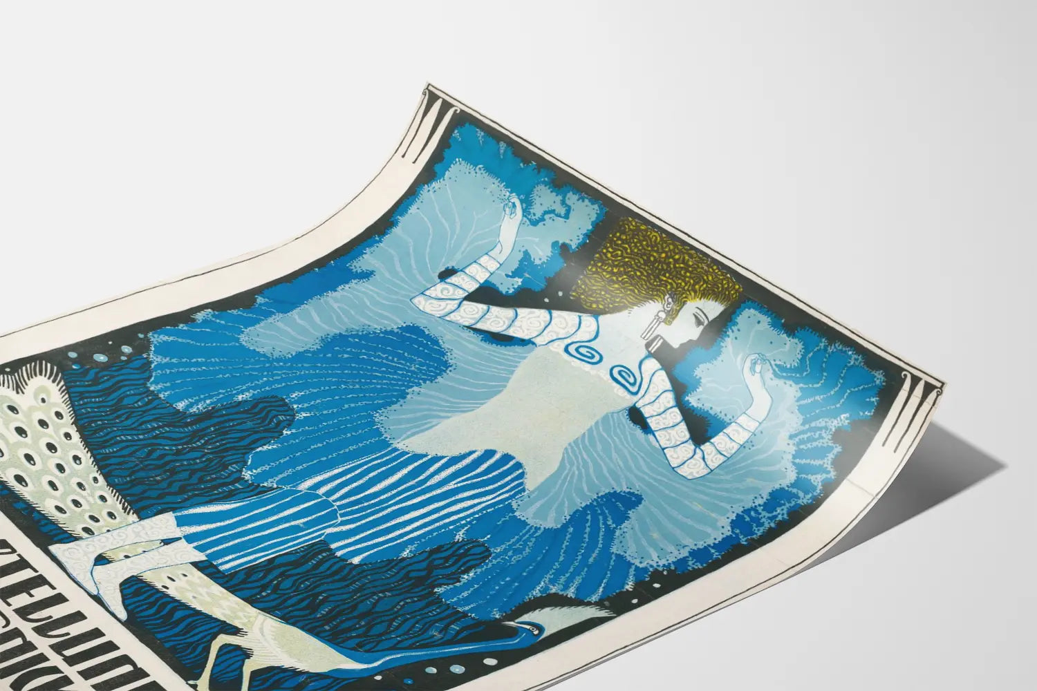 Opdag dette fængslende vintage plakat, designet til at promovere udstillingen med L.H. Jungnickel på Kunstgewerbemuseet i Frankfurt am Main. Dette vægdekoration plakat illustrerer elegant en stiliseret kvindelig figur, klædt i grafiske blå og hvide mønstre, ledsaget af en fugl i matchende farver, alt sammen i art déco-stil. Kompositionen fremhæver en stærk kontrast mellem nuancer af blå, hvid og sort, understøttet af gule detaljer i kanten, hvilket skaber en atmosfære, der er både elegant og dynamisk. Dette originale maleri passer perfekt ind i en retro- og kunstnerisk stemning, ideelt til at berige et interiør med passion for design og kunsthistorie. Perfekt som vægdekoration i en stue, et kontor eller et kunstgalleri, giver denne plakat dine vægge et sofistikeret og autentisk præg. Det grafiske stiludtryk samt typografien på plakaten afspejler tidens ånd og tilfører et unikt præg til moderne opholds- eller arbejdsrum. Som dekorativ plakat henvender den sig til kunstentusiaster og samlere, der værdsætter art déco-estetik og historiske udstillingsværker. Integrer dette stykke i din samling for at tilføre et kunstnerisk og kulturelt præg til din indretning.