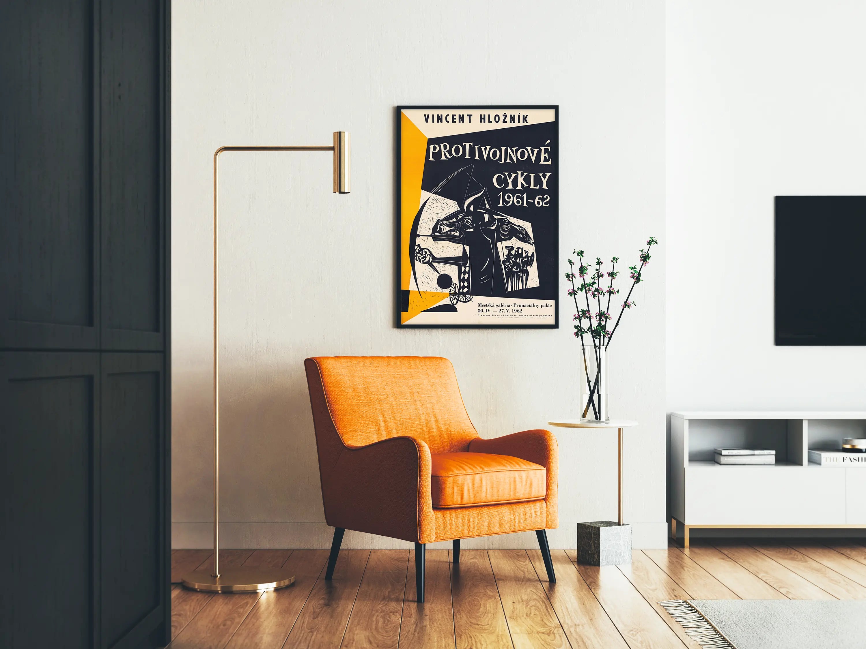 Dette kunstneriske plakatsværk af Vincent Hložník med titlen "Protivojnové cykly 1961-62" er et markant vægdekorationselement, der tilfører et strejf af udtryk og dybde til ethvert interiør. Med en grafisk stil præget af en slående kontrast mellem sort og okker fanger dette plakatsværk straks opmærksomheden med sin symbolske illustration og originale typografi. Grafikken viser abstrakte og figurative former, herunder en central figur med tre hoveder af dyr og menneskelige silhuetter i baggrunden, hvilket antyder en kraftfuld besked om fred og anti-krig. Dette kunstneriske plakatsværk er ideelt for dem, der ønsker at berige deres vægdekoration med et engageret og æstetisk værk, der tilføjer en historisk og kulturel dimension til deres rum. Udført i nuancer af sort, hvidt og orange, skiller dette vægdekorationselement sig ud gennem sin balance mellem enkelhed og visuel kompleksitet, hvilket gør det perfekt til en nutidig eller moderne indretning. Giv dit interiør et vægmaleri, der stimulerer refleksion og samtidig pynter med karakter, takket være dette unikke plakatsværk signeret Vincent Hložník.