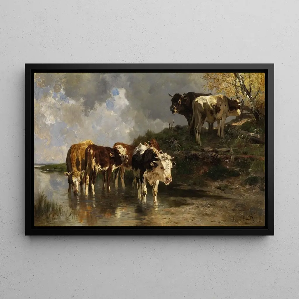Anton Braith, tysk maler fra det 19. århundrede, er kendt for sine værker, der hylder naturens skønhed og det landlige liv. Påvirket af den romantiske bevægelse formåede han at fange essensen af landskabet gennem rige og stemningsfulde kompositioner. Hans karriere, præget af stor opmærksomhed på detaljer og en palette af levende farver, har gjort ham til en ikonisk repræsentant for pastoral kunst. Hans malerier, såsom Bétail ved vandkanten, vidner om hans kærlighed til det dyre- og planteliv, samtidig med at de afspejler tidens bekymringer, hvor naturen ofte blev idealiseret.