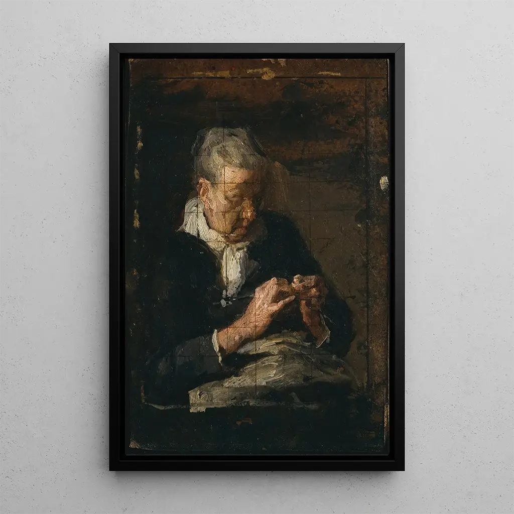 I dette delikate kunsttryk præsenterer Thomas Eakins os for en kvinde, der er opslugt af at strikke, et øjeblik af ro og koncentration. Kompositionen fremhæver blidheden i linjerne og formerne, mens de varme farver skaber en indbydende atmosfære. Det naturlige lys, der belyser scenen, fremhæver detaljerne i strikketøjet og ansigtet, hvilket afslører en følelsesmæssig dybde. Dette kunsttryk, både intimt og universelt, vækker skønheden i daglige gestus og fredeligheden i et øjeblik fanget i tiden.