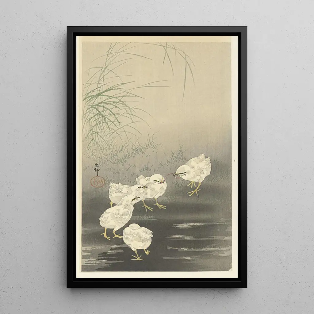 Kunsttrykket af værket "Poussins et ver" af Ohara Koson fordyber os i en verden præget af blidhed og ro. Ungerne, gengivet med bemærkelsesværdig omhu, synes at stige op af en fredelig verden, mens ormen, symbol på naturen, integreres harmonisk i scenen. Pastelfarver, domineret af bløde nuancer af gul og grøn, skaber en beroligende atmosfære. Træsnit-teknikken, karakteristisk for japansk kunst, giver dette lærred en unik tekstur, næsten taktil, og inviterer betragteren til at fordybe sig i denne delikate skildring af det vilde liv.