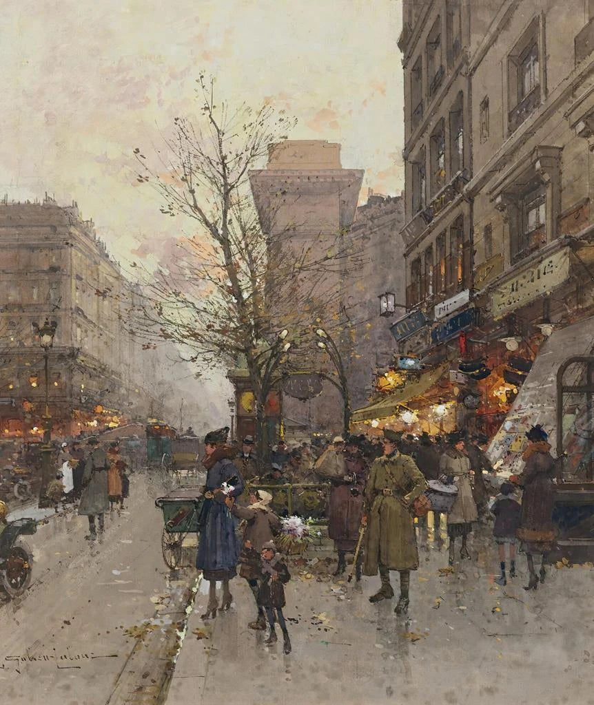 Eugène Galien-Laloue, født i 1854, er en fransk maler, der dedikerede sin karriere til at skildre bylandskaber og monumenter i Paris. Hans værk tilhører post-impressionismens strømning, men han blev også påvirket af impressionisternes teknikker. Hans kærlighed til byens lys afspejles i hver eneste af hans kreationer. Galien-Laloue formåede at etablere sig som en mester i bymaleri, og hans værker er i dag eftertragtede blandt samlere og kunstelskere. Hans unikke tilgang til lys og farve banede vejen for mange kunstnere, der fulgte i hans fodspor. Ved at fejre ikoniske steder
