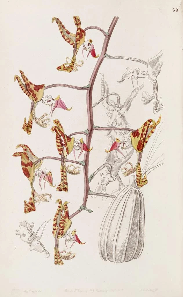 La gongora tricolore tachetée skiller sig ud med sine eksotiske former og prikkede mønstre, der tiltrækker opmærksomhed. Dette værk, udført med bemærkelsesværdig præcision, fremhæver den unikke skønhed af denne orkidé. Nuancerne af gult, rødt og grønt blander sig harmonisk og skaber en livlig og dynamisk atmosfære. Kunsttrykket af denne sjældne blomst af Sydenham Edwards inviterer til at udforske botanikens vidundere, samtidig med at det fejrer mangfoldigheden af former og farver, som naturen har at byde på.