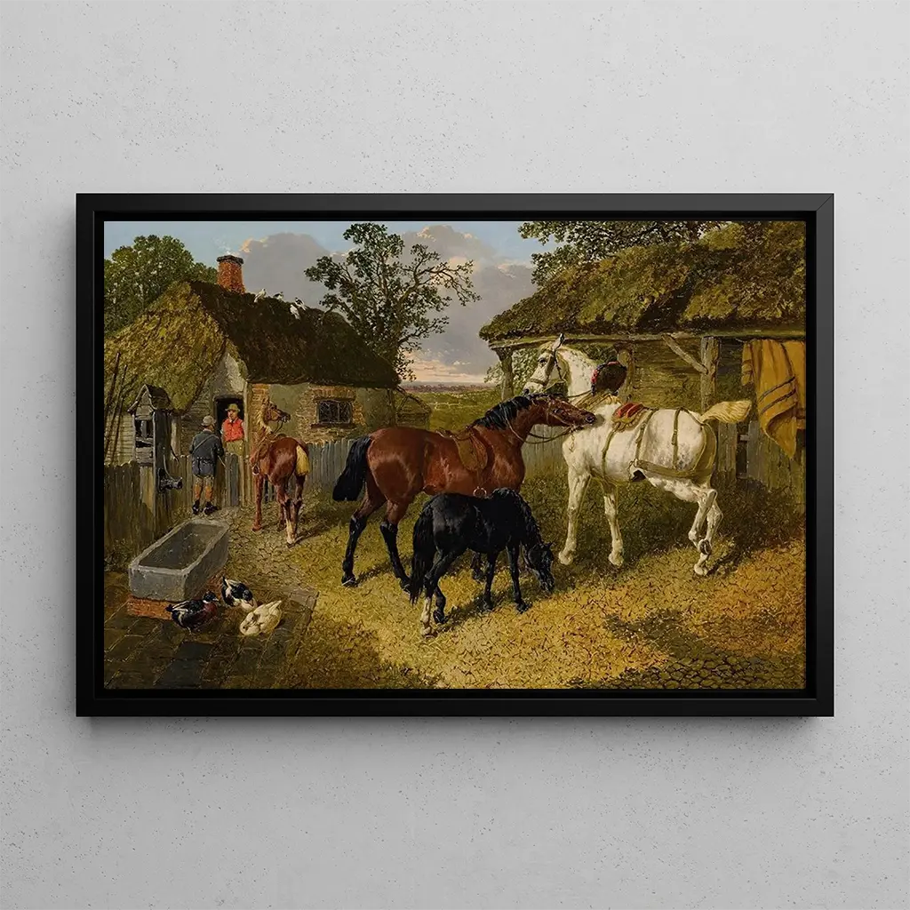 kunsttryk La Cour de l'écurie af John Frederick Herring le Jeune fanger et levende og dynamisk øjeblik af livet på gården. De jordfarvede farver og de detaljerede skildringer af dyr og personer fordyber seeren i en livlig scene, hvor den daglige aktivitet udfolder sig under en lysende himmel. Herring's teknik, der kombinerer realisme og følsomhed, gør det muligt at mærke energien i denne gård, hvor hvert element, fra heste til bønder, synes at få liv. Dette maleri vækker en nostalgi for en enkel og ægte livsstil, samtidig med at det fejrer skønheden i det landlige liv.