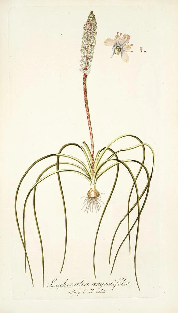 Nikolaus Joseph Freiherr von Jacquin, botaniker og kunstner fra det 18. århundrede, satte sit præg på sin tid med sine bidrag til botanik og kunst. Hans rejser rundt om i verden gav ham mulighed for at opdage og dokumentere mange plantearter, herunder Lachenalia angustifolia. Hans kunstneriske stil, præget af videnskabelig præcision og æstetisk følsomhed, afspejler oplysningstidens ånd, hvor nysgerrighed og opdagelse var i højsædet. Jacquin efterlader således en arv, der forener skønhed og viden, og som påvirker fremtidige generationer af kunstnere og videnskabsfolk.
