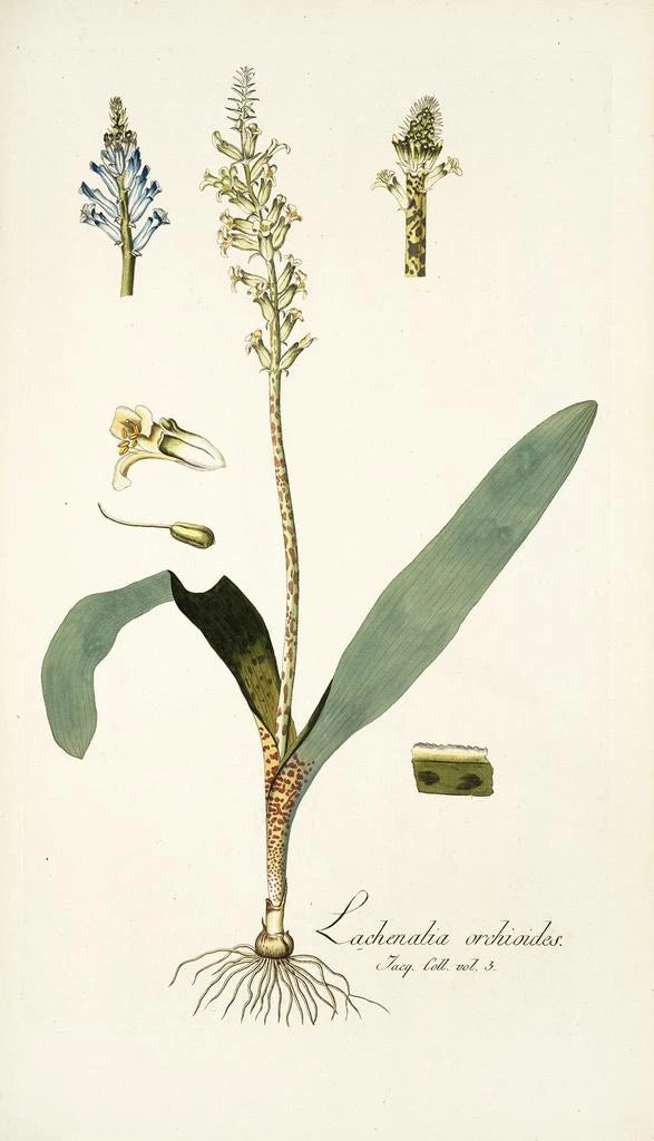 Nikolaus Joseph Freiherr von Jacquin, en markant skikkelse i det 18. århundrede, formåede at forene sine passioner for kunst og botanik. En anerkendt botaniker, rejste han verden rundt for at studere og illustrere sjældne plantearter. Påvirket af datidens videnskabelige strømninger, bidrog han til dokumentationen af eksotiske planter, samtidig med at han udviklede en unik kunstnerisk stil. Lachenalia orchioides illustrerer perfekt denne fusion mellem videnskabelig stringens og kunstnerisk følsomhed, hvilket gør Jacquin til en forløber inden for botanisk illustration. Hans værk fortsætter med at inspirere kunst- og naturentusiaster.