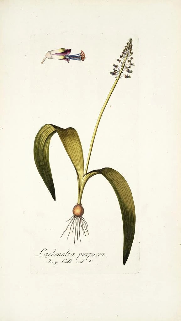Nikolaus Joseph Freiherr von Jacquin, aktiv i det 18. århundrede, er en ikonisk figur inden for botanik og kunst. Født i 1727 i Østrig, blev han påvirket af datidens videnskabelige strømninger, især klassifikationsbevægelsen for planter. Hans værker, ofte skabt under hans rejser, vidner om hans engagement i dokumentationen af eksotiske flora. Som medlem af Videnskabsakademiet bidrog Jacquin til fremskridt inden for botanisk viden, samtidig med at han indgik en kunstnerisk følsomhed i sine fremstillinger. Lachenalia purpurea er en del af denne tradition, der forener videnskab og æstetik.