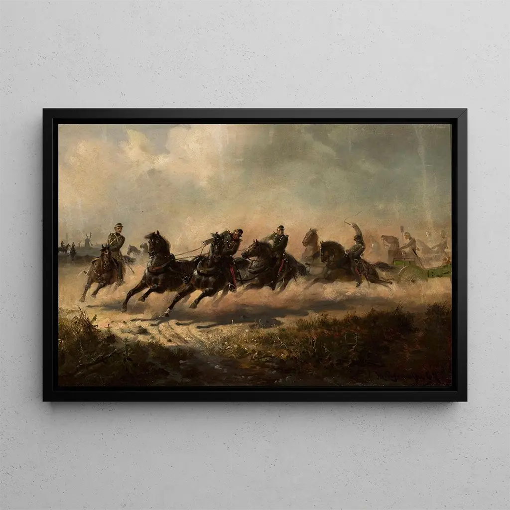 Charge d'Artillerie : et hyldest til militær mod, og kunsttryk "Charge d'Artillerie" af Maksymilian Gierymski skildrer en dynamisk og fængslende scene fra krigen, hvor soldaternes styrke og beslutsomhed er i fokus. De mørke farver og markante kontraster skaber en atmosfære af spænding og hastværk, mens hestene og kanonerne synes at komme til live under kunstnerens pensel. Gierymski formår at fange bevægelsen og energien i denne kunsttryk, hvilket inviterer betragteren til at føle intensiteten af handlingen. Dette kunsttryk er mere end blot en militær repræsentation; det vækker mod og ofring hos mennesker i krigstid.