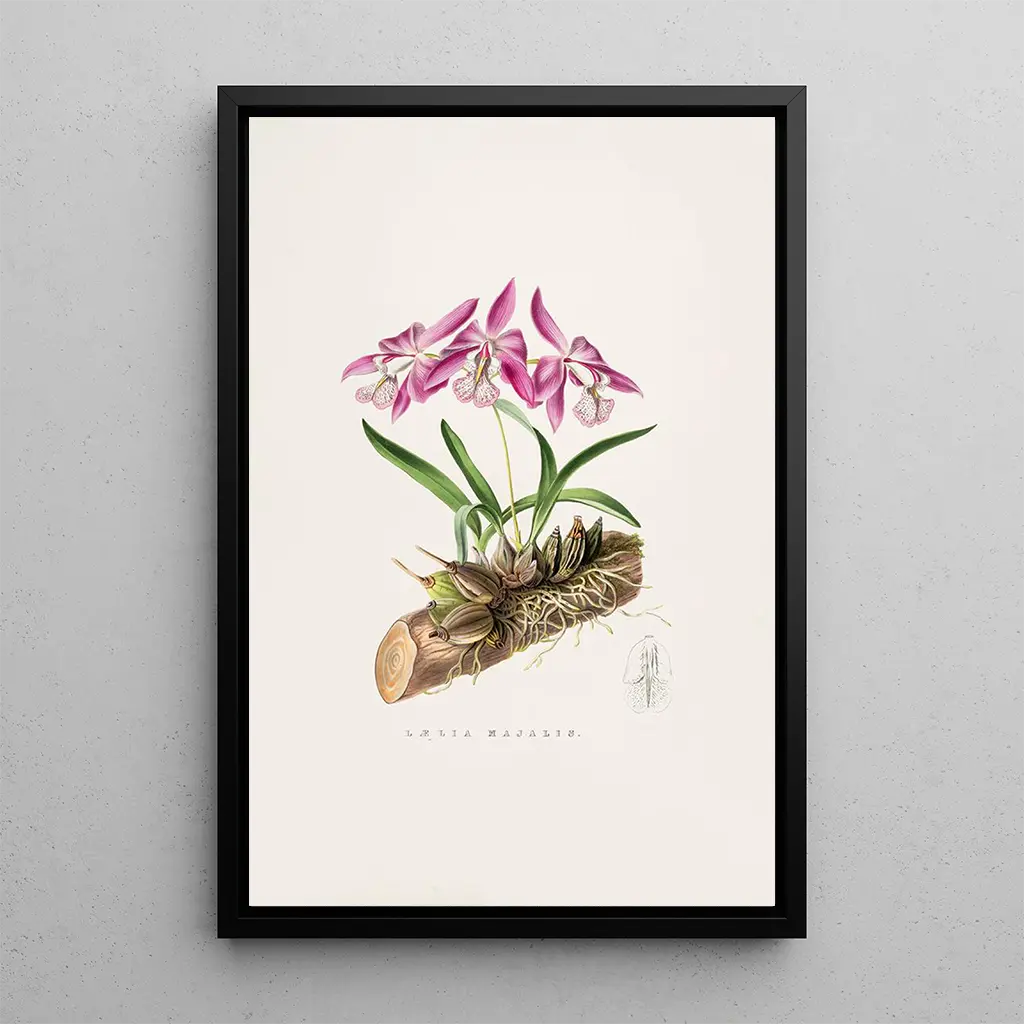 Laelia Majalis, et fængslende kunsttryk af James Bateman, fremkalder ynde og delikatesse i eksotiske blomster. Den blomsterkomposition, rig på detaljer, bruger en palette af livlige og naturlige farver, der spænder fra nuancer af violet til strålende hvide toner. Akvarelteknikken gør det muligt at gengive gennemsigtigheden i kronbladene, hvilket skaber en let og luftig atmosfære. Hvert element i dette lærred synes at danse under lyset, og inviterer betragteren til at dykke ned i en fortryllende blomsterverden, hvor naturens skønhed fremhæves med bemærkelsesværdig præcision.