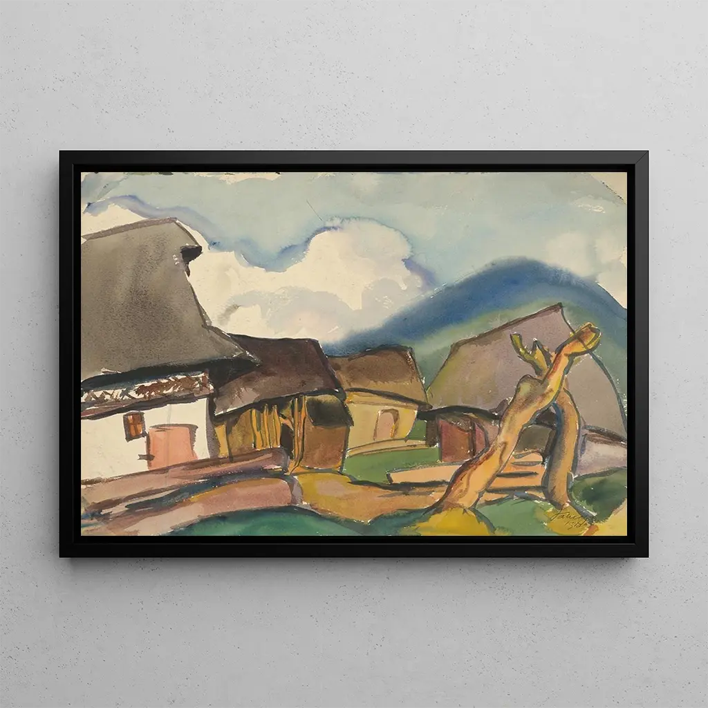 Maleriet Village af Zolo Palugyay fremkalder en landlig verden præget af ro og enkelhed. De jordfarvede nuancer og strejf af gyldent lys skaber en varm atmosfære, hvor hvert element i landskabet synes at fortælle en historie. Palugyay's teknik, kendetegnet ved brede, udtryksfulde penselstrøg, bringer dette maleriske landsby til live, hvor stråtagshuse harmonisk integreres i det omkringliggende landskab. Kunstværket inviterer til refleksion over skønheden i enkle livsformer og harmonien mellem menneske og miljø.