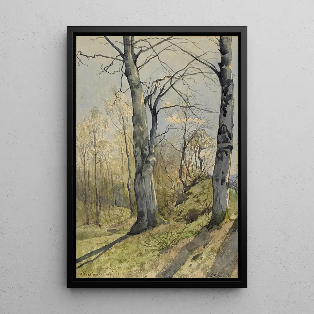 Kunsttrykket "Paysage de sous-bois" af Henri-Joseph Harpignies tager os med til hjertet af en frodig skov, hvor lyset filtrerer gennem det tætte løv. Nuancer af grønt, blandet med strejf af brunt og guld, skaber en varm og livlig atmosfære. Kunstnerens teknik, kendetegnet ved flydende penselstrøg, giver en fornemmelse af bevægelse og liv i dette landskab. Hvert træ, hvert græsstrå synes at vibrere under lysets påvirkning, hvilket inviterer betragteren til at udforske dette rige og fredelige naturlige rum.
