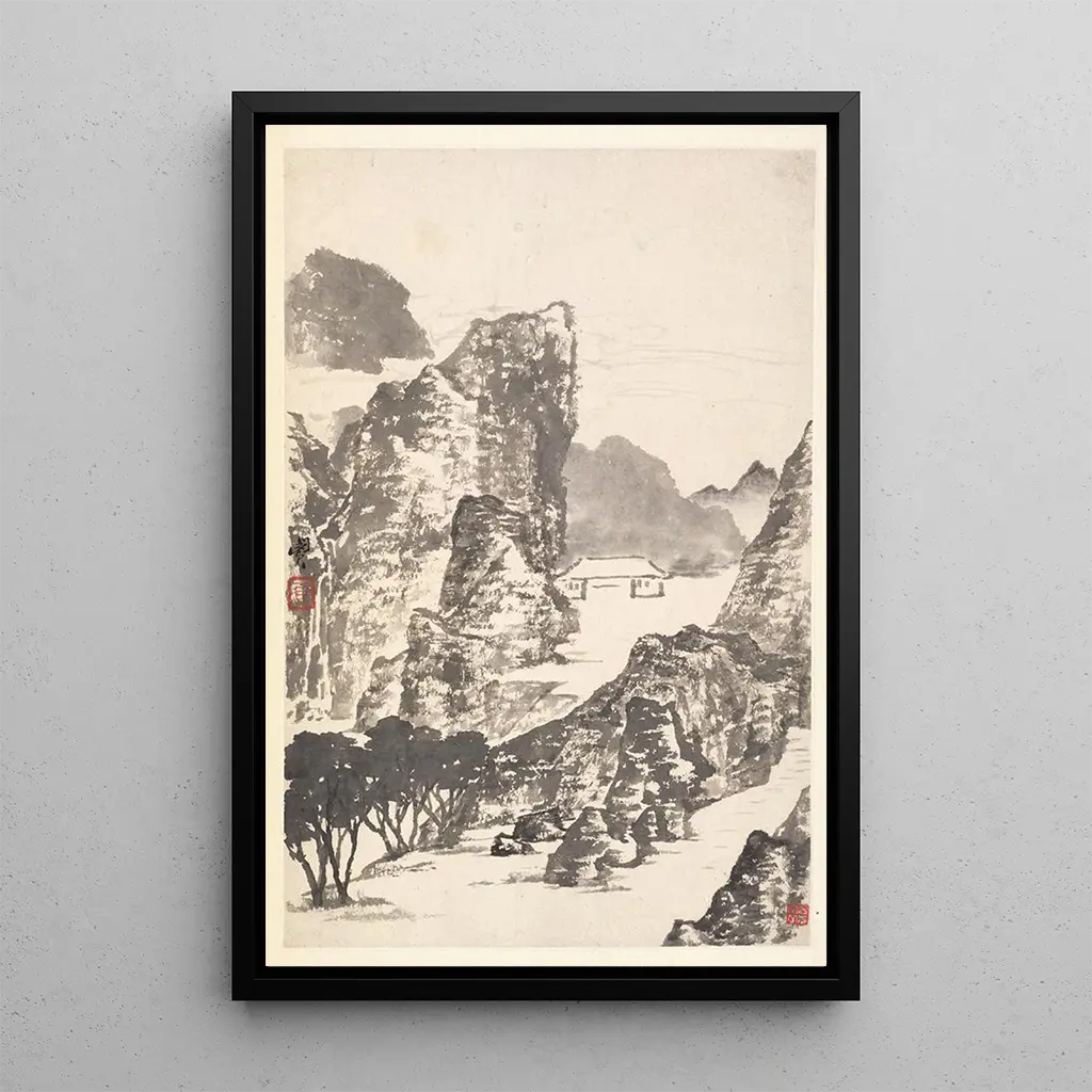 Det kunsttryk "Paysage d'après Mi Fu" fremkalder en dyb ro, hvor majestætiske bjerge smelter sammen med snoede floder. Nuancerne af grøn og blå flettes ind i hinanden og skaber en beroligende atmosfære. Teknikken med blæk på silke, typisk for kinesisk maleri, giver værket lethed og flydende bevægelse. Hvert penselstrøg synes at fange selve essensen af naturen og inviterer betragteren til en stilfærdig refleksion. Dette landskab, både realistisk og idealistisk, afspejler en poetisk vision af verden, hvor harmoni hersker mellem mennesket og dets omgivelser.