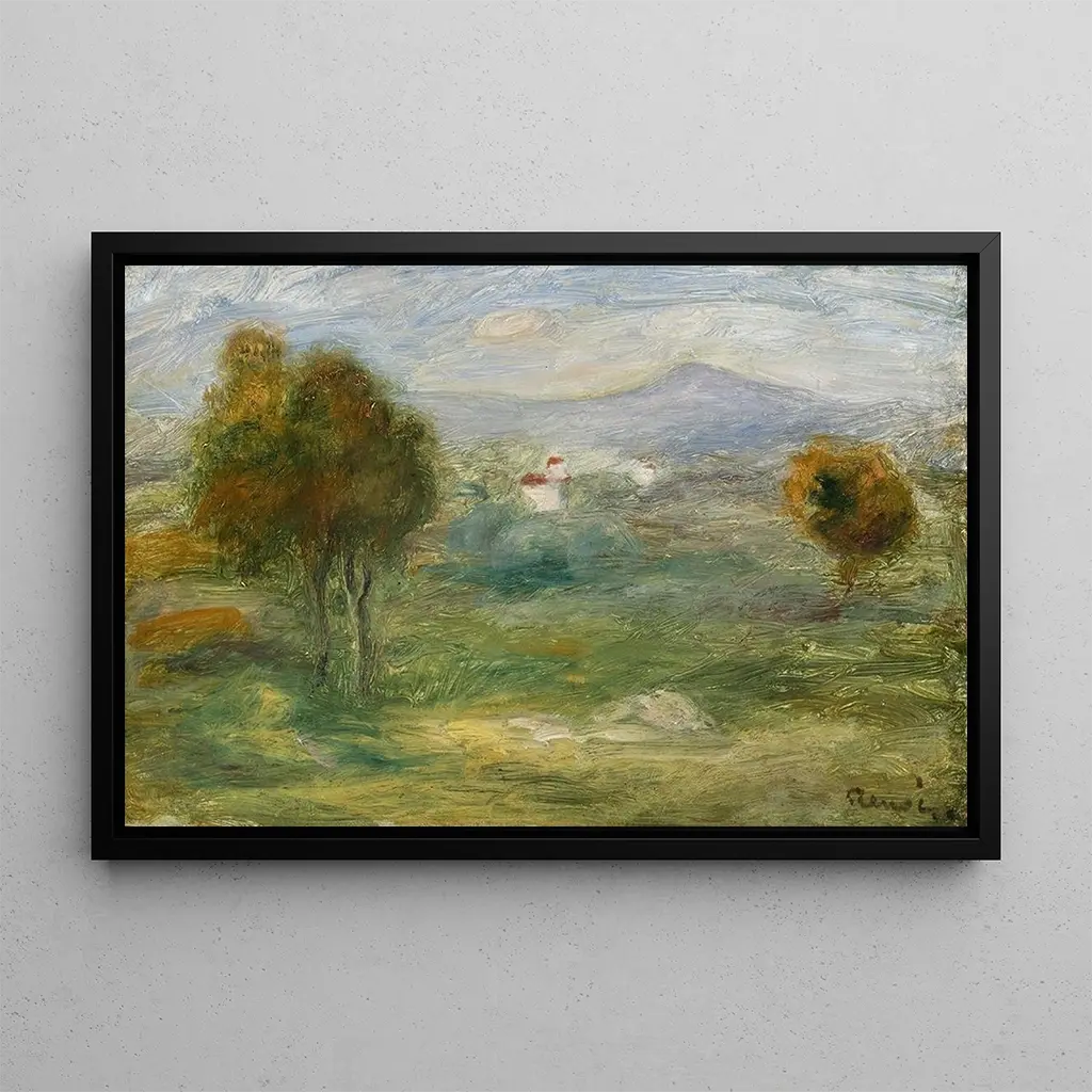 I dette ikoniske kunsttryk tager Renoir os med til hjertet af Côte d'Azur, hvor de farverige huse blomstrer under en azurblå himmel. De flydende og vibrerende penselstrøg afslører en fredelig atmosfære, hvor lyset leger med skyggerne. De varme nuancer af okker og grøn blandes harmonisk, hvilket skaber et levende kunstværk, der inviterer til eftertanke. Den afbalancerede komposition, med husene i forgrunden og den omkringliggende natur, fremkalder en følelse af fred og ro, typisk for Renoirs impressionistiske stil.