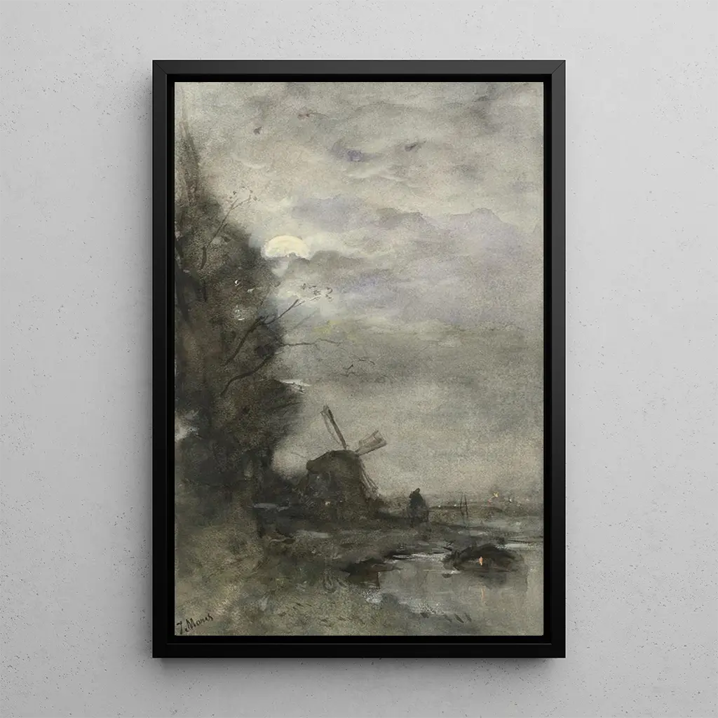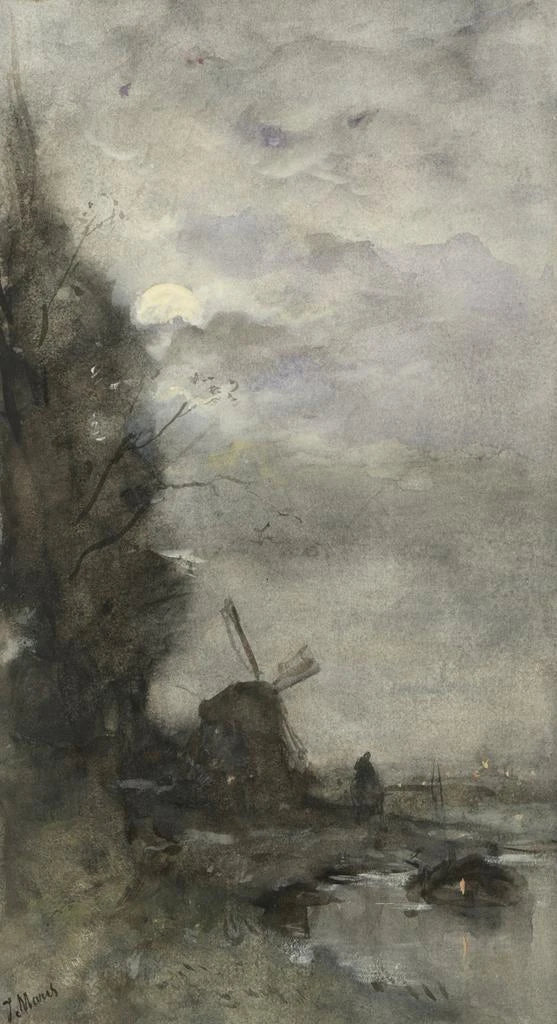 Landskabsmaleri med vindmølle ved måneskin - Jacob Maris | Kunsttryk