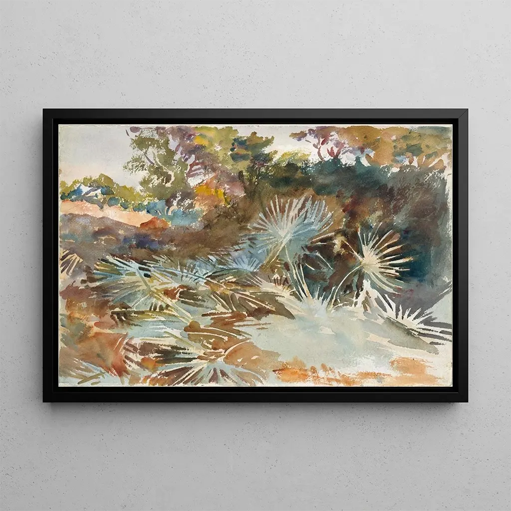 I "Paysage med palmer" tager John Singer Sargent os med til en verden af ro og naturlig skønhed. Dette lærred fremkalder frodige landskaber, hvor palmer står majestætisk under en azurblå himmel. Nuancer af grøn og blå, kombineret med blødt lys, skaber en fredelig og drømmende atmosfære. Sargent, mester i lys og teksturer, formår at fange finheden i bladene og varmen fra solen, hvilket giver en ægte invitation til flugt.