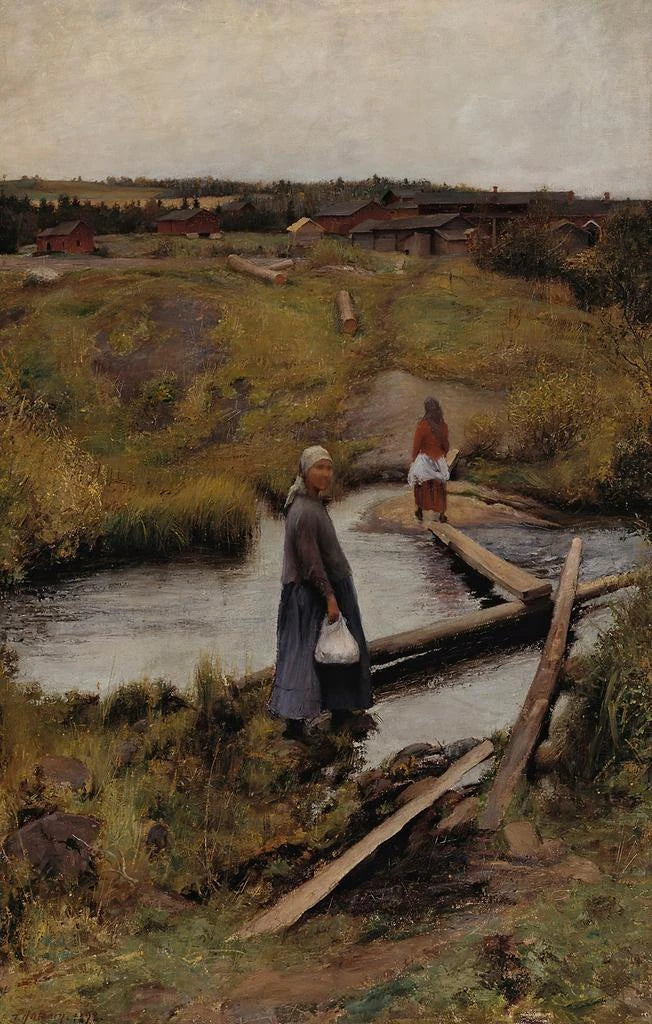 Pekka Halonen, født i 1865, er anerkendt som en af Finlands mest indflydelsesrige kunstnere. Hans værk, der strækker sig over flere årtier, er præget af en dyb forbindelse til naturen og en følsomhed over for menneskelige følelser. Halonen var et aktivt medlem af den finske kunstbevægelse og integrerede elementer af den lokale kultur i sine værker. "Råvejen" illustrerer perfekt hans unikke stil, der blander realisme og impressionisme, samtidig med at den fremhæver skønheden i finske landskaber og kompleksiteten i menneskelige relationer.