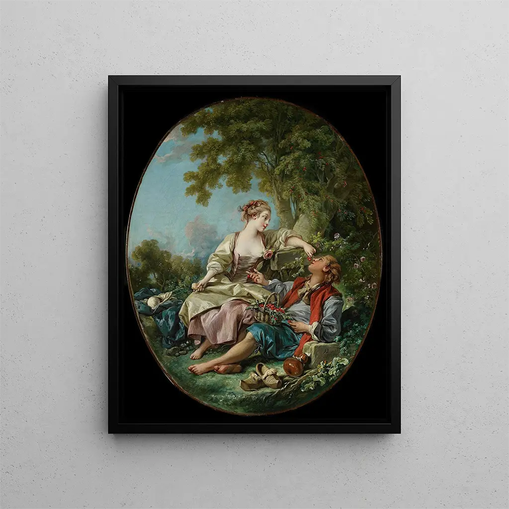 Reproduktion Les Sabots - François Boucher – Introduktion fængslende L'œuvre "Les Sabots" af François Boucher indkapsler essensen af rokokokunsten, en kunstretning der opstod i Frankrig i det 18. århundrede. Dette maleri, rigt på farver og detaljer, transporterer betragteren til en verden præget af lethed og sensualitet. Gennem dette værk inviterer Boucher os til at opdage et øjeblik frosset i tiden, hvor naturen og menneskeheden smukt flettes sammen. Den delikate komposition og de yndefulde figurer fremkalder en drømmeagtig atmosfære, der skaber en subtil dialog mellem det synlige og det usynlige. Kunsttrykket af dette værk tilføjer et strejf af raffinement og kultur til ethvert hjem, samtidig med at det hylder en af de store mestre inden for fransk malerkunst. Stil og særpræg ved værket François Bouchers stil skiller sig ud ved sin dristige brug af pastelnuancer og sin evne til at fange formernes lethed. I "Les Sabots" er figurerne gengivet med en utrolig ynde, deres flydende og naturlige positurer forstærker følelsen af bevægelse. Baggrunden, rigt detaljeret, viser en frodig natur, der næsten synes levende, og omslutter figurerne i en fredelig atmosfære. Lyset spiller en central rolle i dette værk, idet det oplyser ansigterne og tøjet på personerne, samtidig med at det skaber fine skygger, der tilføjer dybde til scenen. Denne opmærksomhed på detaljer og lyskontrol vidner om Bouchers uomtvistelige talent og hans forståelse for menneskelige følelser, hvilket forvandler hvert blik til en immersiv oplevelse. Kunstneren og hans indflydelse François Boucher, født i 1703, er en af de mest ikoniske kunstnere i det 18. århundredes Frankrig. Elev af François Le Moyne, formåede han hurtigt at gøre sig bemærket på den kunstneriske scene med sin unikke stil og innovative tilgang til maleriet. Boucher var også officiel maler for Louis XV's hof, hvilket gav ham mulighed for at efterlade et uudsletteligt aftryk på sin tids kunst. Hans indflydelse strækker sig langt ud over hans egen tid, idet han inspirerede mange kunstnere, herunder impressionistiske malere, der søgte at fange lys og bevægelse i naturen. Den måde, hvorpå han formåede at forene sensualitet
