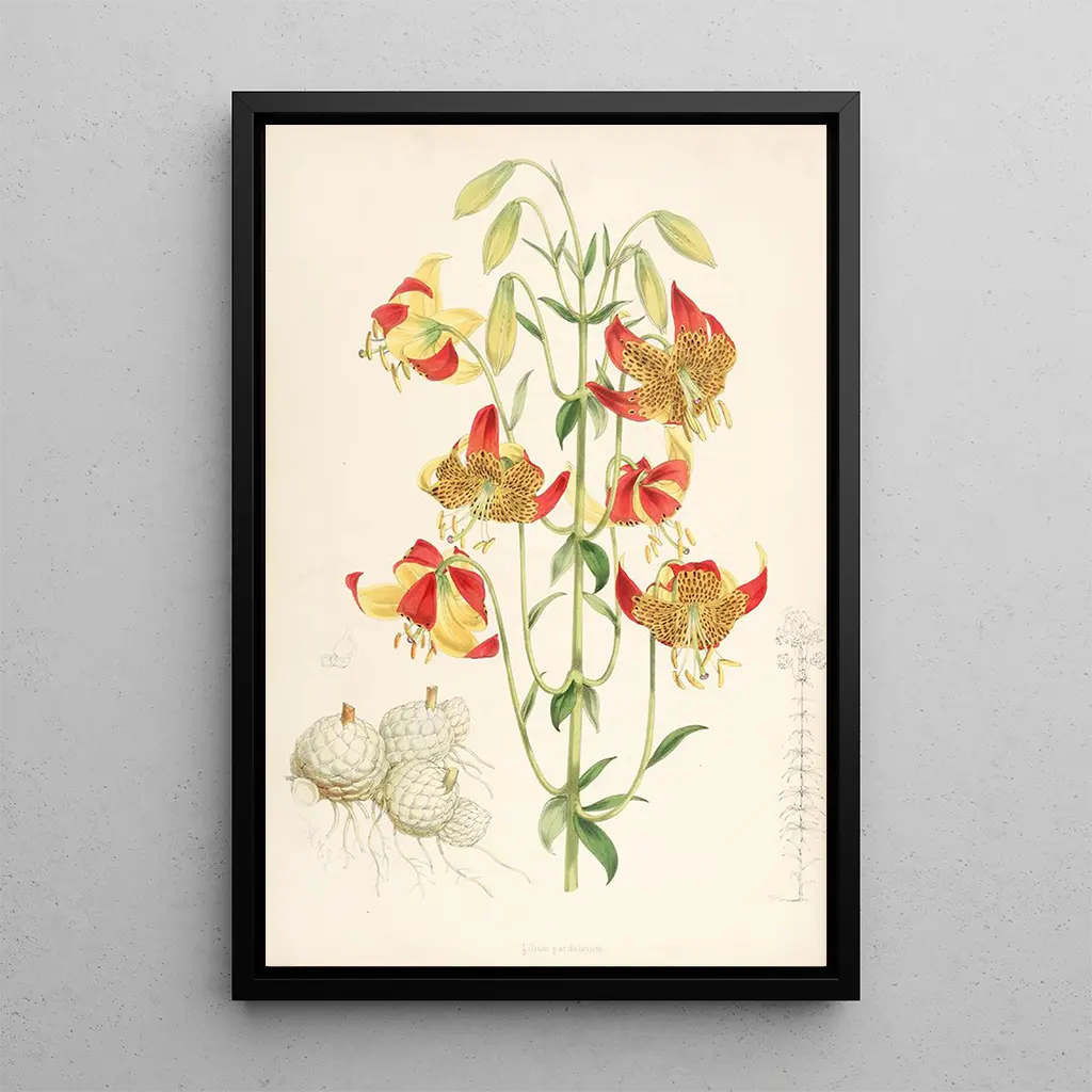 Lilium pardalinum, også kendt som leopardlilje, er et livligt kunsttryk, der fanger essensen af naturen. Med sine delikate kronblade og iøjnefaldende farver, der spænder fra gult til rødt, fremkalder dette kunsttryk en følelse af friskhed og vitalitet. Den akvarelteknik, kunstneren Walter Hood Fitch anvendte, skaber subtile nuancer og harmoniske overgange, der bringer hvert detalje i blomsten til live. Atmosfæren, der udspringer af dette lærred, er både beroligende og inspirerende, og inviterer betragteren til at dykke ned i en verden af ro og eftertanke.