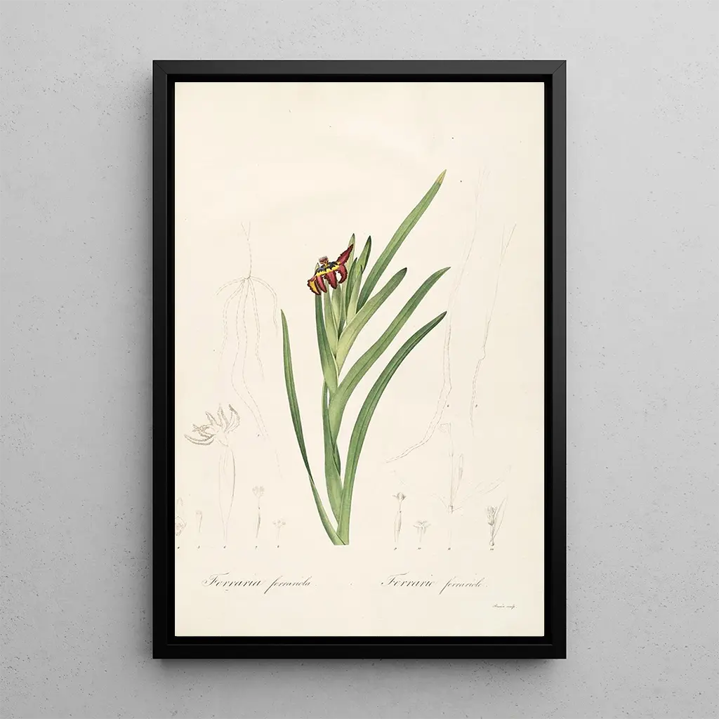 I denne kunsttryk af Les Liliacées Pl63 inviterer kunstneren Pierre Joseph Redouté os til at dykke ned i en delikat verden, hvor hver enkelt kronblad synes at vibrere under lyset. Kompositionen, omhyggeligt udarbejdet, fremhæver nuancer af grønt og violet, der smukt væves sammen. Gouache-teknikken giver mulighed for at gengive blomsterteksturen næsten håndgribeligt, hvilket skaber en atmosfære af ro og raffinement. Hvert detalje er omhyggeligt gengivet, hvilket vidner om en opmærksom observation af naturen, og giver værket en næsten levende dimension.