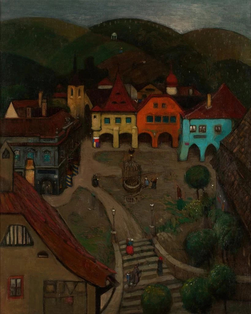 Oplev den charmerende atmosfære i denne smukke kunstplakat af Richard Teschner, der fanger essensen af en lille bys idyl. Perfekt til at tilføje et strejf af elegance og kultur til dit hjem eller kontor.