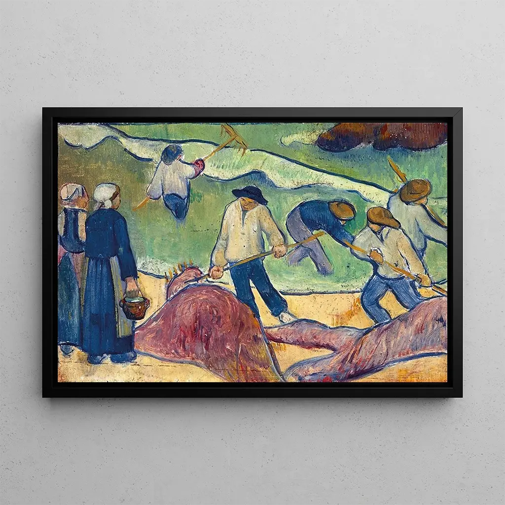 I denne kunsttryk af Petit landskab med tangfiskere dykker Paul Sérusier ned i en verden, hvor naturen og mennesket eksisterer i perfekt harmoni. De levende farver, der spænder fra dybe grønne til beroligende blå nuancer, skaber en rolig og eftertænksom atmosfære. Teknikken med cloisonnisme, som er karakteristisk for kunstneren, viser sig her gennem skarpe konturer og flade farvefelter, hvilket giver en enkel og rig læsning. Fiskerne, de centrale figurer i kompositionen, synes at integrere sig i dette idylliske landskab og inviterer betragteren til at dele deres øjeblik af fred.