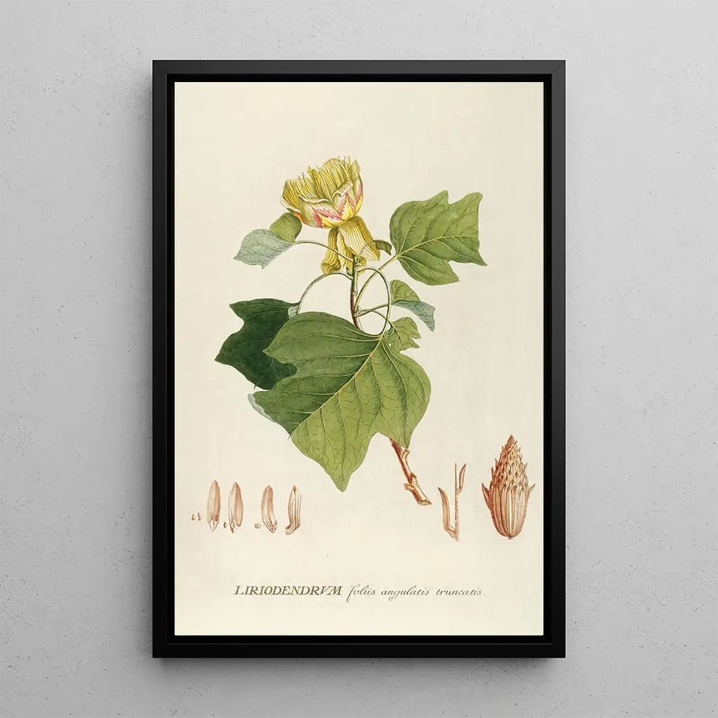 kunsttryk "Liriodendrum" af Georg Dionysius Ehret er en fascinerende fremstilling af naturen, der fanger den delikate essens af dette majestætiske træ. De livlige farver og de omhyggelige detaljer i værket afslører en raffineret graveringsteknik, hvor hvert blad og hver blomst synes at få liv. Atmosfæren, der udspringer af dette kunsttryk, er både beroligende og inspirerende, og inviterer betragteren til at dykke ned i en botanisk verden rig på nuancer og teksturer. Lyset spiller en vigtig rolle, fremhæver de organiske former og skaber en dialog mellem skygge og lys.