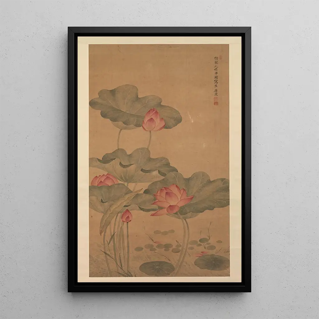 Kunsttrykket Lotus rouge og fisk af Tang Guang er et fængslende værk, der fejrer harmonien mellem dyreliv og planteliv. De livlige farver på lotusblomsten, der kontrasterer med de bløde, vandige nuancer, skaber en levende og beroligende scene. Den blækmaleri-teknik, der er typisk for kinesisk kunst, giver kunstneren mulighed for at fange letheden i fiskenes bevægelser og blomstens majestæt. Dette værk fremkalder en følelse af indre fred og inviterer betragteren til at dykke ned i en verden af ro og naturlig skønhed.