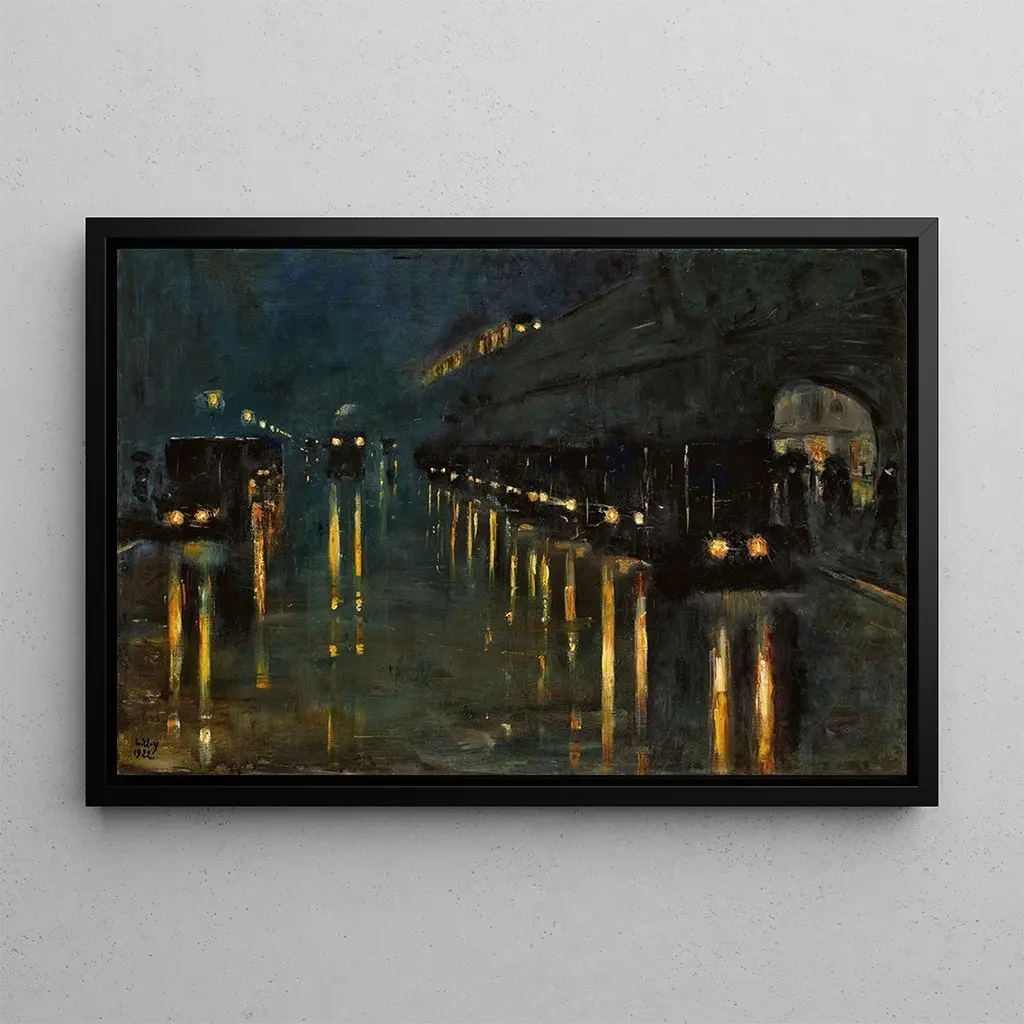 Den "Luftbaneanlægget Blowstraße om natten" af Lesser Ury er et fængslende kunsttryk, der fanger den pulserende energi i nattelivet. De blinkende lys fra gadelygter og udstillinger reflekteres på de våde brosten, hvilket skaber en atmosfære, der er både dynamisk og melankolsk. Ury bruger mørke farver og lysglimt til at fremkalde dybden i natten, mens de slørede silhuetter af forbipasserende tilføjer en menneskelig dimension til denne urbane scene. Kunstnerens olie-maleriteknik giver en rig tekstur og en fordybende atmosfære, der bringer betragteren ind i hjertet af byen.
