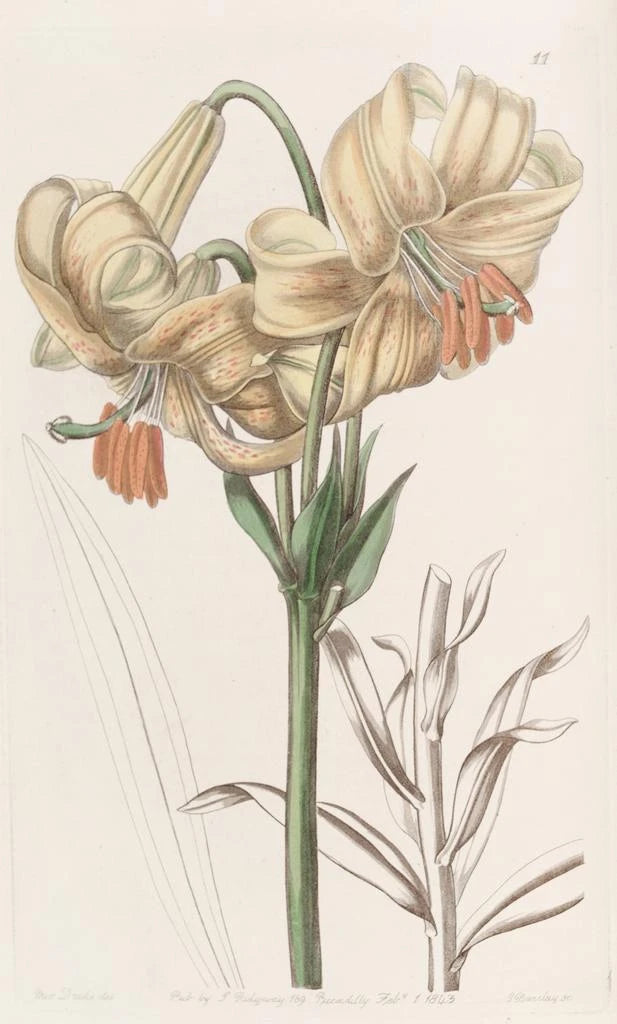 Maleriet "Lys du Japon jaune" af Sydenham Edwards fanger den flygtige skønhed af denne majestætiske blomst. Kronbladene, i en strålende gul nuance, folder sig yndefuldt ud, mens grønne nuancer i bladene skaber en slående kontrast. Akvarelteknikken, anvendt af Edwards, formidler gennemsigtigheden og letheden af blomsterne, hvilket fremkalder en rolig og kontemplativ atmosfære. Hvert detalje er omhyggeligt arbejdet, hvilket inviterer betragteren til at dykke ned i en verden af blidhed og poesi, hvor naturen står i centrum.