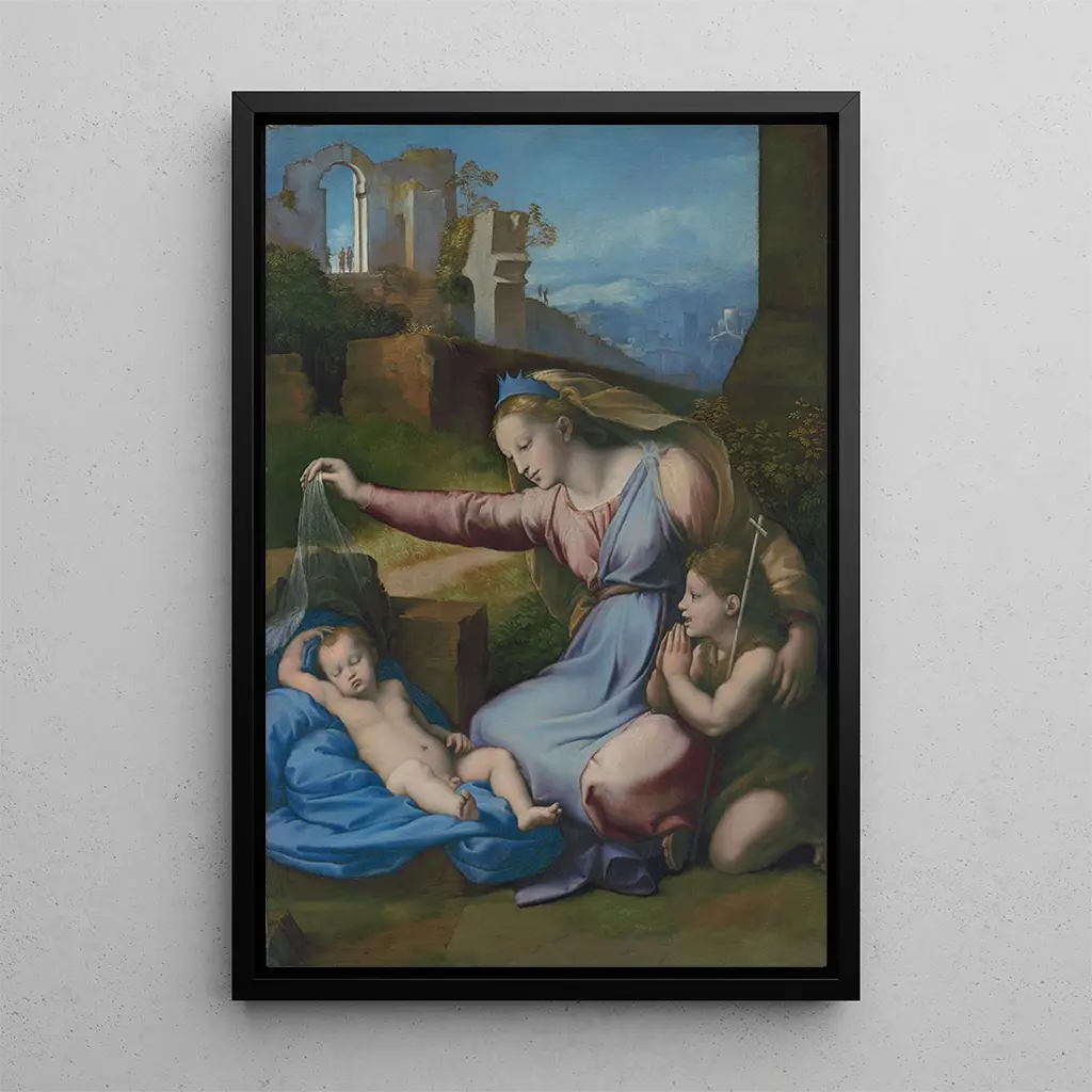 Raphaël, født i 1483, er en af de mest indflydelsesrige kunstnere i den italienske renæssance. Hans værk, præget af en søgen efter perfektion og harmoni, er formet af hans interaktioner med andre store mestre fra tiden. La Madone med den blå diadem, malet omkring 1506, illustrerer perfekt hans unikke stil, der kombinerer realisme og idealisering. Dette kunsttryk vidner om vigtigheden af Jomfru Marias fremstilling i den kristne kunst, samtidig med at det afspejler renæssancens humanistiske værdier, hvor individet og spiritualitet står i centrum.