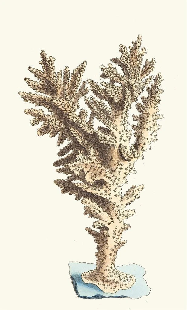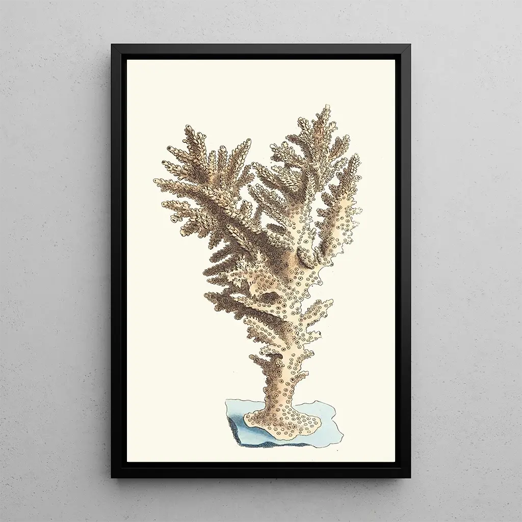 George Shaws kunsttryk Madrepore muricé inviterer os til at udforske undervandsverdenens vidundere. Med dybblå nuancer og livlige koralstrøg fremkalder dette værk rigdommen og mangfoldigheden af det marine liv. Shaw, der bruger en omhyggelig maleteknik, formår at fange den delikate tekstur af koraller og de flydende former i havet. Atmosfæren, der udspringer af dette lærred, er både beroligende og fascinerende, og transporterer os til et univers, hvor naturen regerer som herre.