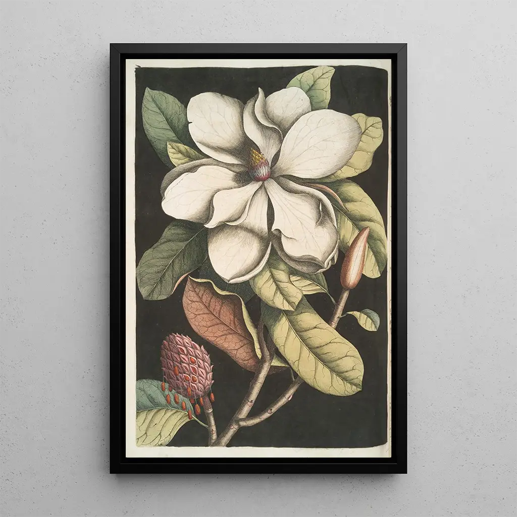 La kunsttryk de Magnolia altissima, également connue sous le nom de laurier de Caroline, évoque une atmosphère de sérénité et de beauté naturelle. Les couleurs douces et les détails minutieux de cette œuvre capturent la majesté de la plante, avec des nuances de vert éclatant et des touches de blanc pur. La technique de l’aquarelle, utilisée par Mark Catesby, permet de rendre la délicatesse des pétales et la richesse des feuillages. Cette toile invite à une contemplation paisible, où chaque élément semble vibrer d'une vie propre, transportant le spectateur dans un jardin luxuriant.