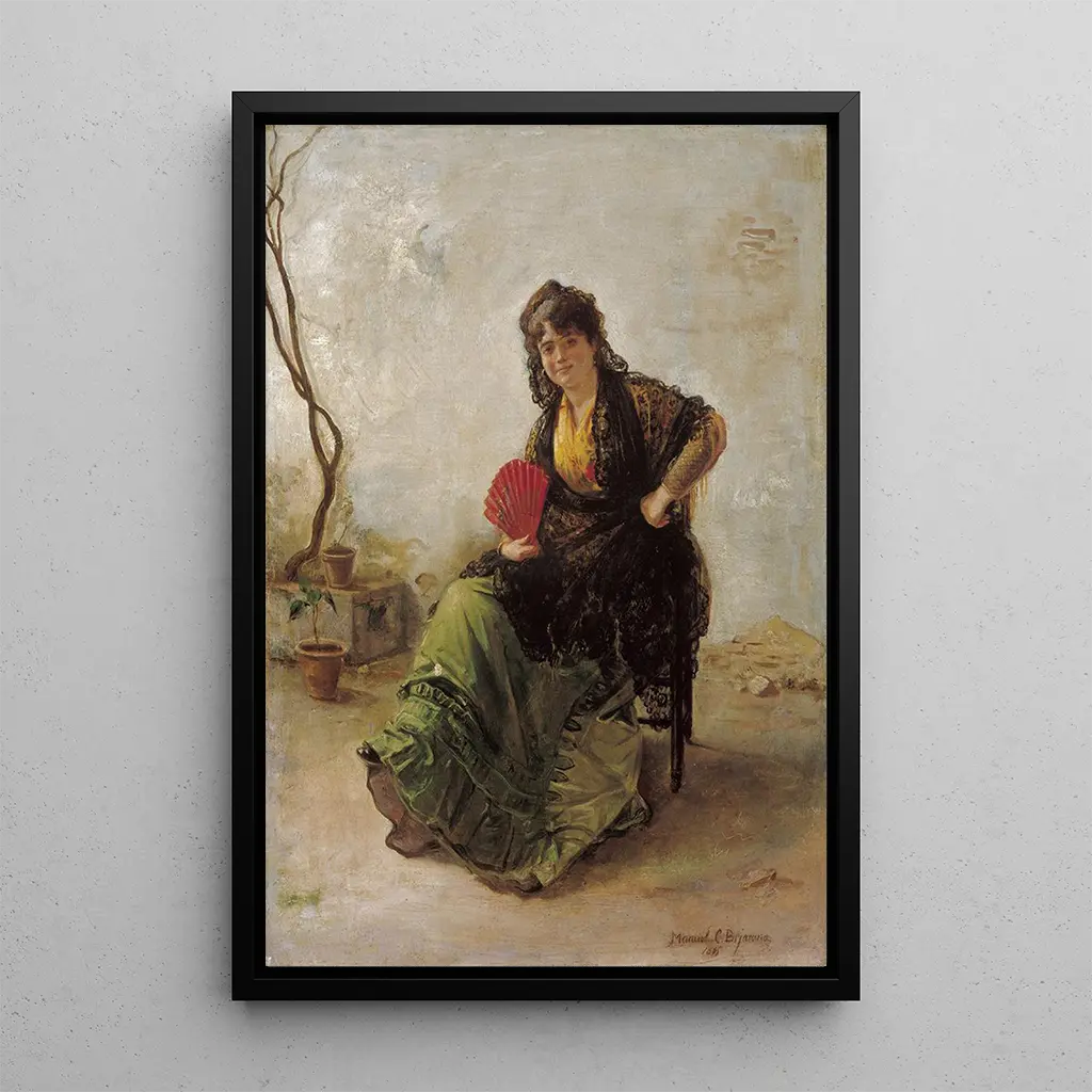 Kunsttrykket af "Maja med rød håndventilator" afslører en kvinde med slående skønhed, indhyllet i et klæde, der fremhæver hendes kurver. Manuel Cabral Aguado Bejarano bruger rige farver og iøjnefaldende kontraster for at give liv til dette fængslende portræt. Den røde håndventilator, et ikonisk tilbehør, tiltrækker opmærksomhed og tilføjer en dimension af mystik og forførelse til værket. Stemningen er både intim og dristig, hvilket inviterer betragteren til at dykke ned i den fascinerende verden af Maja, en ikonisk figur i den spanske kultur.