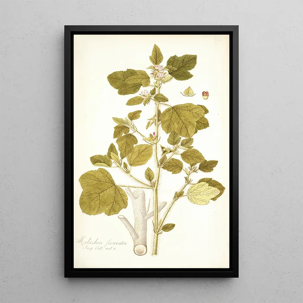 Kunsttrykket af Malachra fasciata, værk af Nikolaus Joseph Freiherr von Jacquin, fører os ind i en frodig verden, hvor naturen udtrykker sig med glans. Dette lærred, rigt på detaljer, fremhæver de delikate blade og de livlige blomster i denne tropiske plante. Nuancerne af grøn, gul og violet flettes harmonisk sammen, hvilket skaber en atmosfære, der både er beroligende og opkvikkende. Kunstnerens teknik, der kombinerer botanisk præcision med kunstnerisk følsomhed, inviterer os til at beundre den flygtige skønhed i floraen. Hvert penselstrøg synes at fange lyset, hvilket hylder naturens storhed.