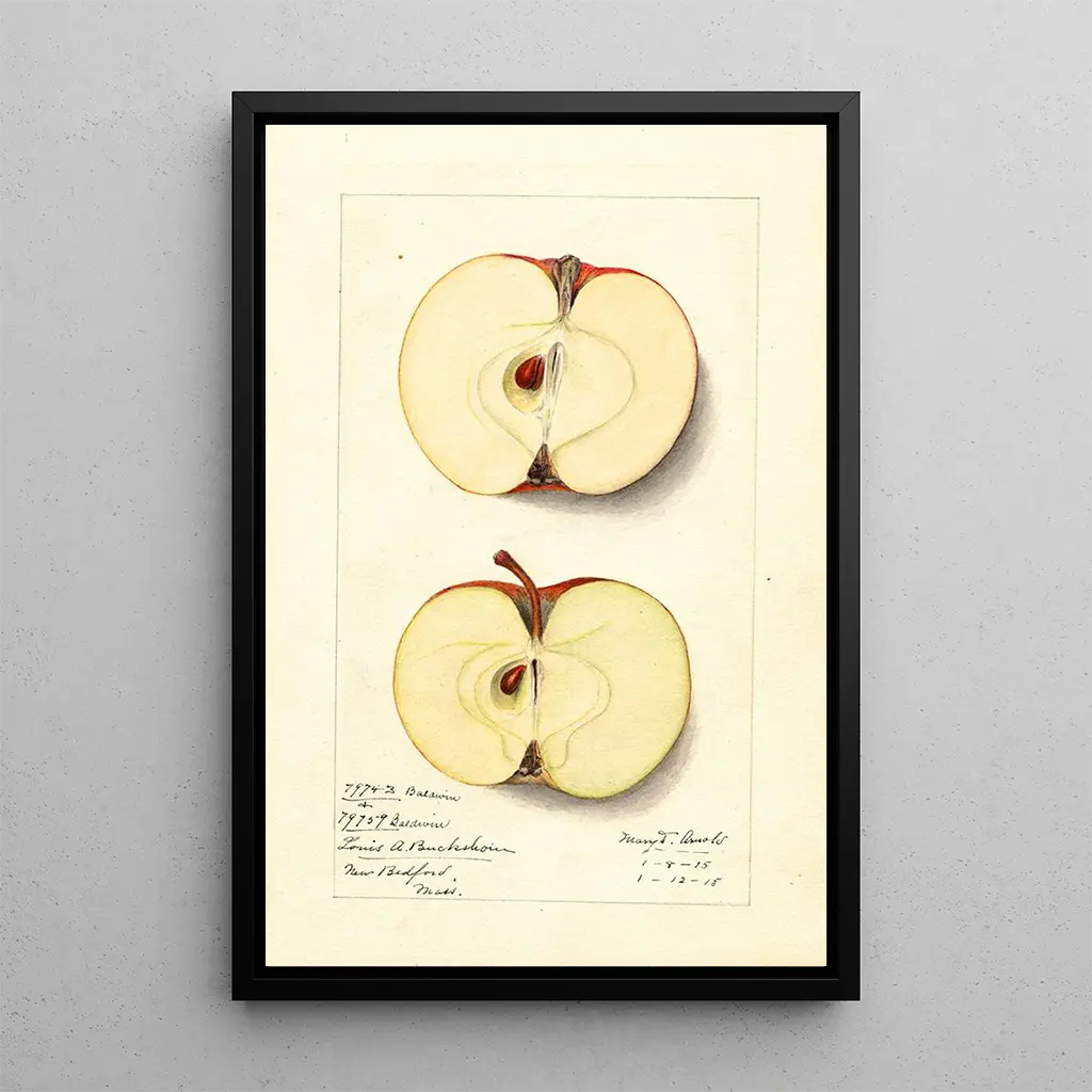 Kunsttrykket af Malus domestica Baldwin transporterer os til en efterårshave, hvor æblerne i gyldne og røde nuancer næsten synes håndgribelige. Hvert detalje i dette værk er omhyggeligt gengivet, fra de subtile nuancer i frugtens skind til de fine skygger, der omgiver dem. Mary Daisy Arnold formår at fange essensen af denne æblesort, hvilket vækker minder om høst og hjemmelavede tærter. Den varme og nostalgiske atmosfære i dette lærred inviterer til drømmerejse, og fejrer sæsonernes skønhed og høstens rigdom.